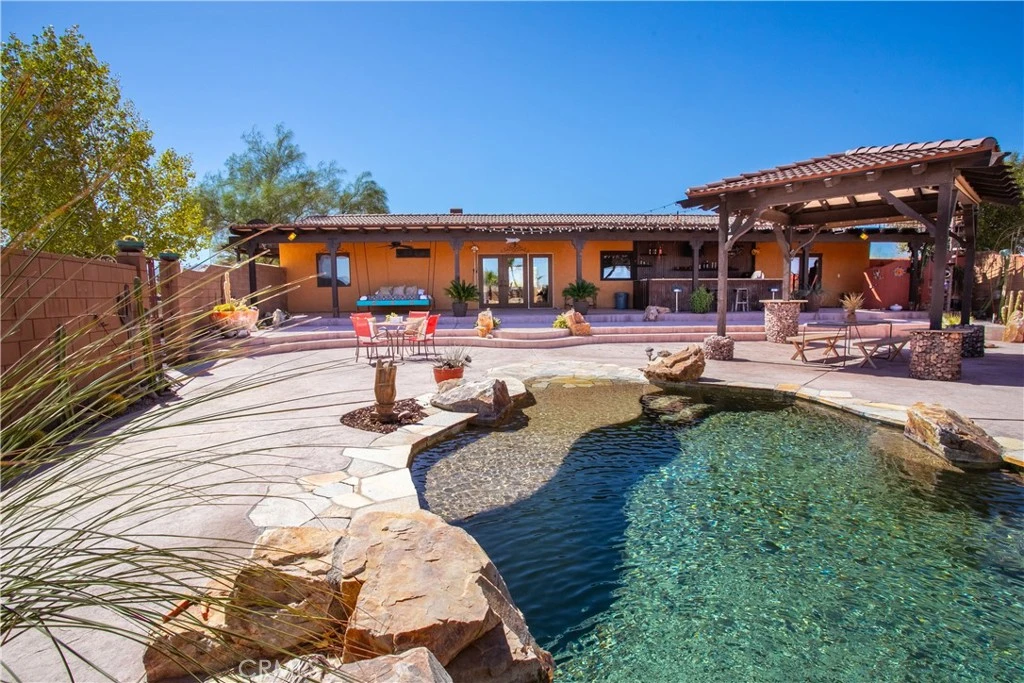 MOJAVE HACIENDA: Nestled at the edge of untouched desert land, this stunning Spanish-style ranch home is the last house on the paved road, offering unrivaled privacy and panoramic views of Joshua Tree National Park. FULLY PERMITTED STVR. Featuring a full-blown resort backyard, surrounded by walls for privacy, where you can head over to the pebble tech pool with a beach entrance and stone waterfall! Lounge at the custom covered cabana with a wet bar and bbq. Rinse off in the luxurious handmade outdoor shower. Climb the circular staircase to the roof deck for 360° stargazing views, or relax in the swinging outdoor daybed! Comes complete with FULLY PAID SOLAR net zero package that powers both the main residence and guest house! All these features barely scratch the surface of this amazing property. The main house boasts a sprawling open floor plan, highlighted by a custom tiled adobe-style fireplace, a large primary bedroom with an en-suite bath with double-doors leading to the pool lounge, in addition to two guest rooms. The entrance doors are handmade in Mexico and outfitted with handblown glass. A meticulously landscaped front yard showcases beautiful old-growth desert flora. For added versatility stands a RV glamping village behind the resort with two vintage trailers for family or guests to sleep in, and a gym/workshop with a cozy wood-burning stove and handmade wood hewn three-dimensional wall. Whether hosting gatherings with children and relatives or creating a personal desert retreat, this compound is a rare opportunity to own a piece of paradise with endless potential. The icing on the cake is a fully permitted SECOND 2-BED, 2-BATH HOME (ADU/guesthouse) separate from the main resort house, adding tremendous value. Rent the second home as a long-term rental, or live in it while you rent out the resort as an Airbnb, or house extended family. Whether seeking a sprawling short term rental, or a home with an extra house to rent to help pay the mortgage, or a place for your own extended family and in-laws to peacefully coexist, the Mojave Hacienda has you covered!