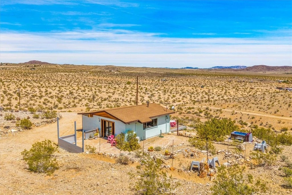 ***RARE MOUNTAIN-TOP GETAWAY*** Perched on a peak in the Bunker Mountains, this homestead cabin was converted to a single-family residence and reimagined with sensible design and touches of flair. It is only a few minutes to downtown Joshua Tree and has been a very successful vacation rental for years. It would also make an amazing private getaway home. The 5-acre site is at the top of a mountain with hiking all around the site. Mountain top property is extremely rare in Joshua Tree, as most of the mountains are government owned. The interior features an open floor plan with a sleeping nook, a sitting area, a modern kitchen with a vintage stove, and a large dining or work table. Huge widows on all sides capture forever views in every direction, including sun and moon rises over Copper Mountain. The exterior patios offer sun or shade with hand-made rock walls, planters and pathways that lead to separate lounging areas, all with amazing views. A pathway of round stepping stones leads to the hot tub. Sitting in the hot tub makes you feel like you’re floating in the sky. This home is truly special!