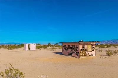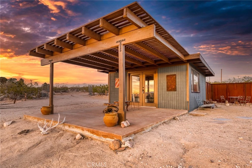 Set on 5 expansive acres in the desirable Sunfair Heights neighborhood of Joshua Tree, this classic 1956 homestead cabin offers a rare opportunity for investors seeking an authentic desert property with room to grow. The approximately 16' x 17' structure has been thoughtfully improved while preserving its historic charm, creating a stylish and functional retreat surrounded by wide-open desert landscapes and panoramic views in every direction. Inside, the cabin features a bright sleeping and living space with wood plank ceilings, recessed lighting, large windows, and glass French doors that bring in abundant natural light and frame the surrounding desert scenery.The interior also includes a well-appointed bathroom with bifold doors, a tiled shower, toilet, and single-sink vanity, along with a full walk-in wardrobe for generous storage. While the cabin currently does not include a kitchen, there is ample space to add a simple one if desired, offering flexibility for future improvements. Outside, a concrete patio with a wood pergola creates a shaded outdoor living area perfect for relaxing under the desert sky, complemented by an L-shaped metal fence along the left side of the cabin. The property is connected to electric and city water and includes a septic system sized for a future 3–4 bedroom home, making it an excellent foundation for expansion or additional development. An on-demand electric hot water heater is already in place. Located just a short drive from the iconic landscapes of Joshua Tree National Park and the vibrant shops, galleries, and restaurants of downtown Joshua Tree, this property combines privacy with convenient access to one of Southern California’s most sought-after desert destinations. Whether preserved as a minimalist desert retreat, expanded into a larger residence, or used as a base for a future development project, this unique homestead cabin presents a compelling investment opportunity in a region known for its natural beauty, creative community, and growing demand for distinctive desert properties.