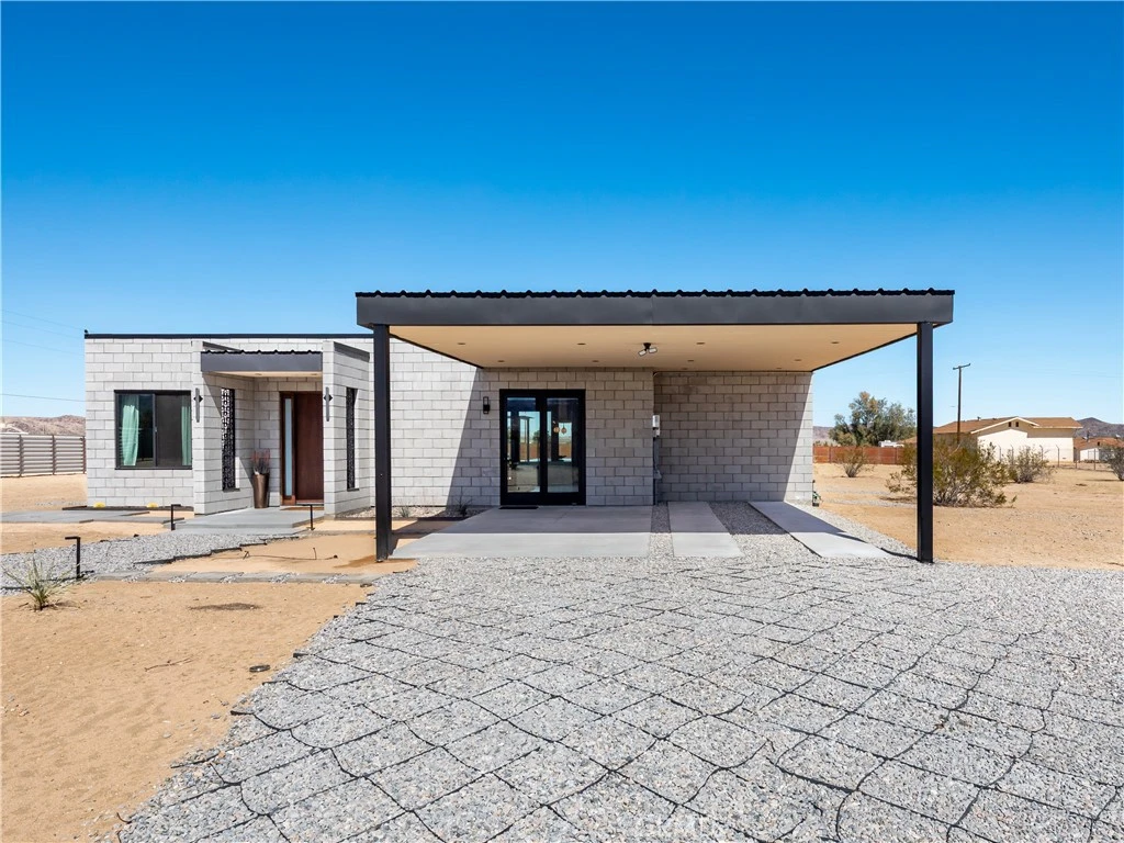 RARE CONCRETE BLOCK CONSTRUCTION – Newly built with materials inspired by original 1950s Mid-Century Modern homes. Featuring energy-efficient, fire-resistant Omni Block construction. Turn-key and fully furnished with high-quality finishes. Open-concept floor plan with polished concrete floors throughout. Two bedrooms offer sliding glass doors opening to a private courtyard. Fully fenced 1.38-acre parcel provides exceptional privacy and sweeping views of the Joshua Tree National Park ridgelines to the south. Equipped with ductless mini-split systems for efficient zoned heating and cooling, built-in speaker system, and 220V EV charging. Outdoor amenities include a hot tub, fire pit, and flat-top grill—perfect for entertaining and stargazing. Meticulously built with custom design details throughout. Peaceful rural setting with direct access to surrounding wilderness. A must-see property.