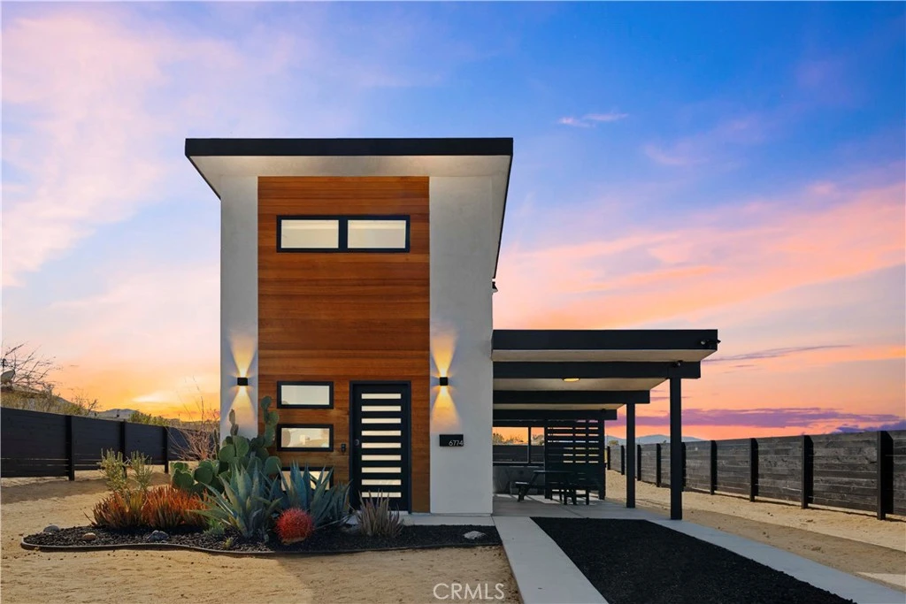 Casita Conejo, the Original Joshua Tree Tiny House build Airbnb by non-other than Robuilt is offered to you. Famously successful and a treasured icon of the industry and the source of so much influence. Upon approach you'll notice a Volcanic Cinder driveway that matches the general motif of the home. The interior of this tiny and function focused home features, multi function faucets, flexible, dining, living and sleeping spaces The first floor, enter a small but functional living room complete with places to sit, lounge and dine, a kitchen with full size electric stove and overhead microwave. Over head space dedicated to spices, and serve wear and under spaces for appliances and cook wear. Under the full size entry door and stairs is a large L shape closet hiding many home essentials for storage, linens, tech and all other goodies. The bathroom has a full size bathtub shower combo along with multi function faucet and a sleek design. The second floor Provides a light filled space with a walk-in closet similar to the Square footage of the whole first floor and access to the balcony. The balcony has an uninterrupted views across the Joshua Tree Village's arroyo with a covered sitting space. The exterior features the Patio and Pergola the fully fenced yard. On the Patio seats a perfect intimate setting for 4-6 with overhead lighting in the evening and a hot tub with just the perfect view of mountains and hills. The yard is adorned with large ocotillos and local boulders, benches create an opportunistic views of the mountains bordering Joshua Tree National Park and Larger Joshua Tree Valley. This home is centrally located. walking distance to shops and bars, restaurants and the framers market. 5 Minutes to the National Park Entrance. 40 minutes to Palm Springs. and 2 hours from Los Angeles.