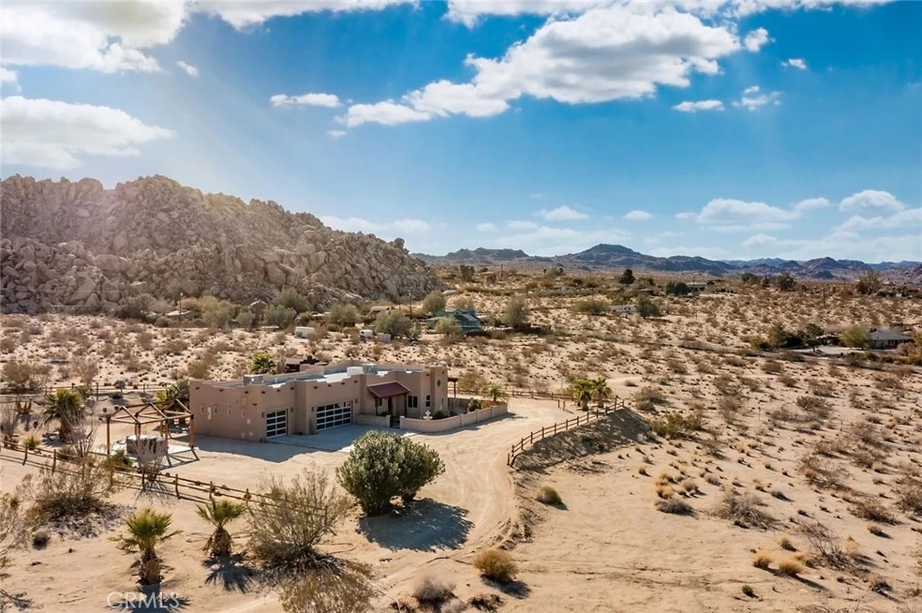 CASA MILLA: Tucked up near Joshua Tree National Park, this splendid property offers wilderness hikes from the backdoor and views of nearby boulder mountains from the back porch. Santa Fe style estate features panoramic views of the Park to the south, sweeping views of the ancient dry lakebed below to the north, and breathtaking sunsets over the mountains of Big Bear to the west. Spread out over 3 bedrooms, including a primary suite offers an ensuite bath, open living areas, in addition to a workspace, and private outdoor access. Active furnished, turnkey Airbnb. Management in place. Exterior includes a spa, firepit, BBQ, outdoor shower and two outdoor bathrooms with a double vanity, set against sprawling desert landscaped grounds. Ideal for large families, entourage, or guests, the home also features a large game room (pool table, TV and oversized games), as well as ample seating for indoor/outdoor dining. For those looking for a workcation, you'll find 3 bedrooms perfectly outfitted with desks/work spaces. Located in the premier South Joshua Tree area and only minutes to downtown Joshua Tree. Access to Interstate-10 leading to LA and Palm Springs International Airport.