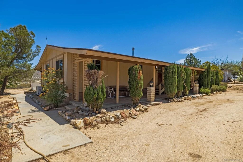 Fixer Opportunity! This 2BD/2BA, 1200+ sq. ft. manufactured home with a bonus 800 SqFt. enclosed sun-patio sits on a fully fenced and gated 1 acre parcel. New freestanding gas stove, new AC Pro GSA 30,000 BTU mini-split, fireplace, leach field upgraded in 2020, RV hookup, shade trees, and views. Rehabilitate and update this private desert home and enjoy the picturesque desertscape, the fresh air, and expansive skies.