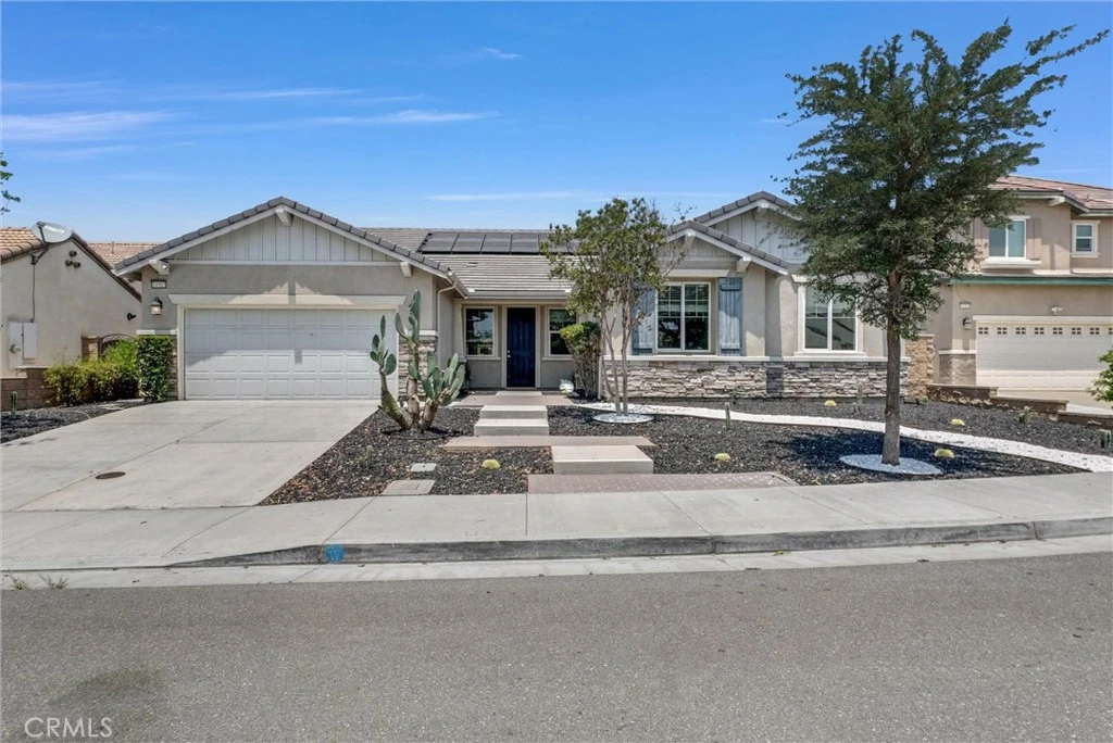 Welcome to this stunning single-story gem in the charming cul-de-sac of Harvest Villages — with no HOA fees! This spacious and thoughtfully designed 5-bedroom, 3.5-bath home offers an elegant open-concept layout perfect for modern living. The primary suite is a true retreat, featuring a luxurious bathroom with dual vanities, a soaking tub, a separate shower, and a large walk-in closet with built-in shelving. A second primary bedroom with its own private ensuite—also with dual sinks and a walk-in closet—offers flexibility for multigenerational living or guest accommodations. In addition to the five generous bedrooms, there’s a versatile bonus room ideal for a home office, gym, or playroom. The dedicated laundry room includes a washer and dryer for added convenience. Enjoy the practicality of a 2-car attached garage, providing secure parking and additional storage space. Step outside to a clean, open backyard — perfect for entertaining, playtime, or simply enjoying the sunshine. Located just minutes from shopping, dining, and entertainment, this home offers quick access to the 10, 15, and 60 freeways, making commuting a breeze. Don’t miss your opportunity to own this beautifully maintained home in a peaceful, well-connected neighborhood.