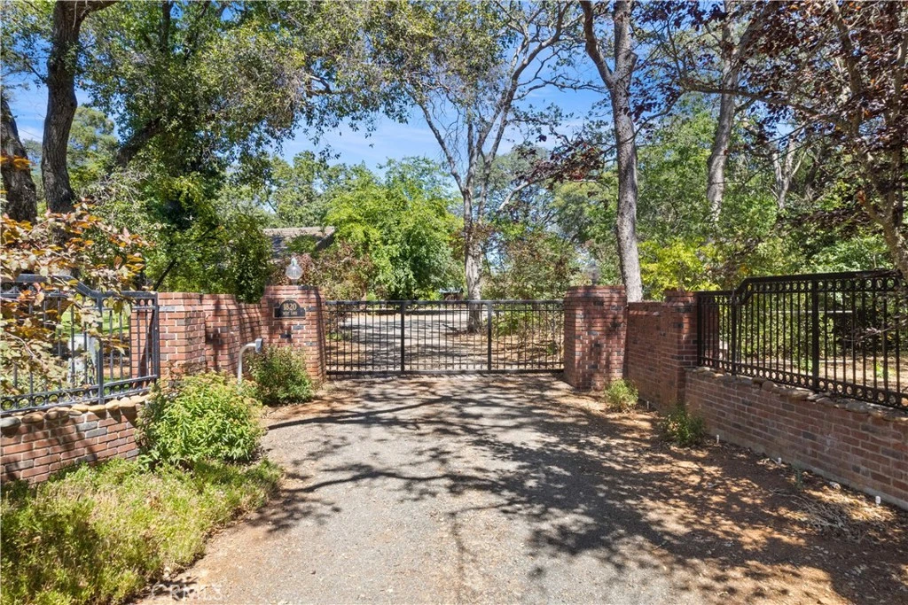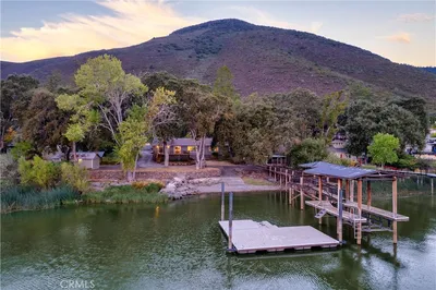 This elegant home in the highly sought-after Buckingham Park, is defined by its refined design & high-quality finishes. The level 1.6-acre lot is fully fenced and features an automatic wrought iron gate, providing both privacy and security. The property also includes a high-producing well with pristine drinking water. Meticulously landscaped with a variety of flowers, shrubs, and an extensive selection of fruit trees, the backyard currently hosts an orchard with banana, citrus, plum, peach, apricot, persimmon, apple, and cherry trees. Multiple large garden beds and a detached shop with space to park two cars, boats, or even an RV. A spacious brick patio, ideal for alfresco dining, is surrounded by lush landscaping and features a unique rock water fountain. Additionally, a river rock fire pit is perfect for making s'mores or enjoying evenings under the stars. The front lawn is framed by strong oaks and roses with filtered views of the lake. The exterior of the home has been recently permeabilized and painted, and the roof is made of durable lifetime concrete tiles. Anderson windows are featured throughout the home, enhancing both style and efficiency. Inside, the main level offers a grand living room, a mid-sized kitchen with a walk-in pantry & a formal dining room that looks out onto the gardens. A large fireplace, 3/4-inch hardwood floors, and picture windows bring in abundant natural light, showcasing stunning views of the lake and front yard. Down the hall, three spacious bedrooms await, along with a remodeled full bath featuring a copper sink and river rock tile, a second full bath, & a powder room for guests. Upstairs, you'll find a den/office space with custom built-in cabinetry and ample storage. The primary suite boasts beautiful views of the front yard and filtered views of the lake. The ensuite bath includes a shower & a separate tub, both tastefully renovated in recent years. A custom-built vanity with a marble countertop and a walk-in closet with high-end cabinetry complete the suite. Above the open living room, a versatile den or office space could easily be converted into a fifth bedroom or used as a TV room. On the south wing of the home, a large studio is already plumbed for a full bath and offers abundant attic storage. This space could easily be transformed into guest quarters with a kitchenette. As part of the Buckingham Park community, you'll also enjoy access to the marina, boat launch, green picnic area & clubhouse.