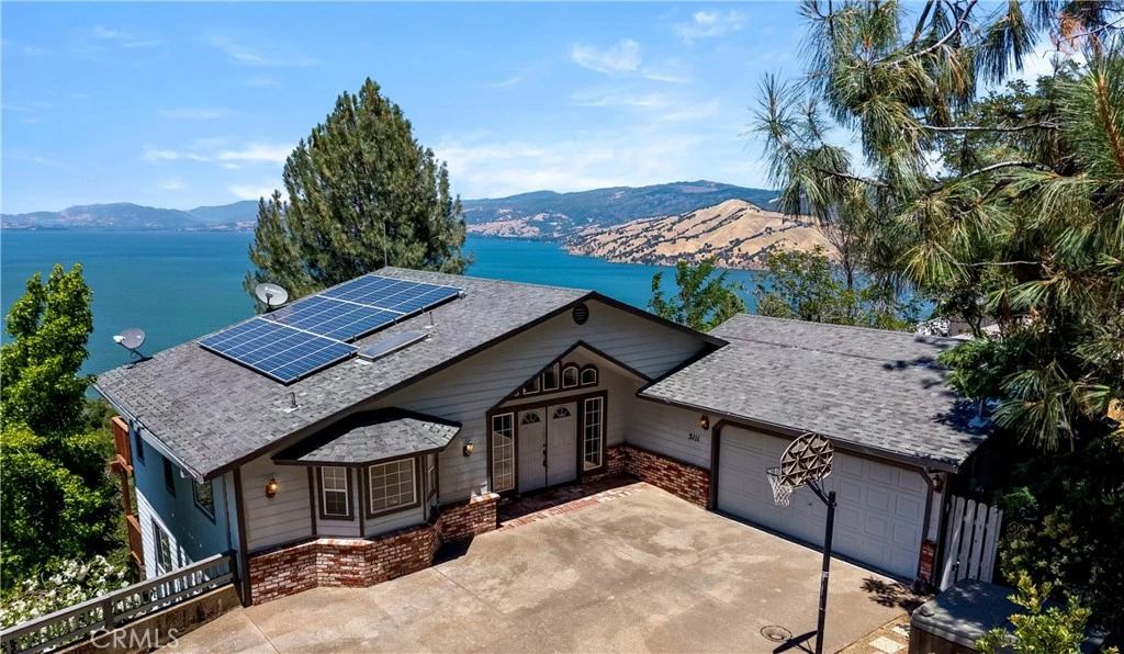 Spectacular panoramic views of Clear Lake on almost a half-acre lot in Riviera Heights with OWNED SOLAR PANELS! This home features over 2,700 square feet of interior space, vaulted ceilings, an abundance of natural light, spacious decks, and ample storage. Situated between two vacant lots this property offers privacy, and magnificent lake views from almost every room. The living room provides floor to ceiling windows, a vaulted ceiling, and a freestanding pellet stove. Close by on the main level you will find the primary bedroom, with walk-in-closet, and en-suite bath. The kitchen features a dedicated dining space, eat-in breakfast counter, pantry, and half-bath. This home has an attached 2 car-garage, with direct access on the main level of the home, plus a flat and level driveway providing 3 to 4 additional parking spaces. As you make your way downstairs you are greeted by an expansive great room with mini-bar, two bedrooms, a full bath, and an oversized deck with more panoramic lake views. Extra storage is located under the lower floor with access from the side of the house. This home is located in the firewise community of Riviera Heights, which is considered to be one of the most favored communities around the lake. This HOA community offers its residents access to a marina & dock, picnic area, pool, and clubhouse available for day use. Make this home your next investment, secondary lake house, or permanent residence! Home inspection on file.