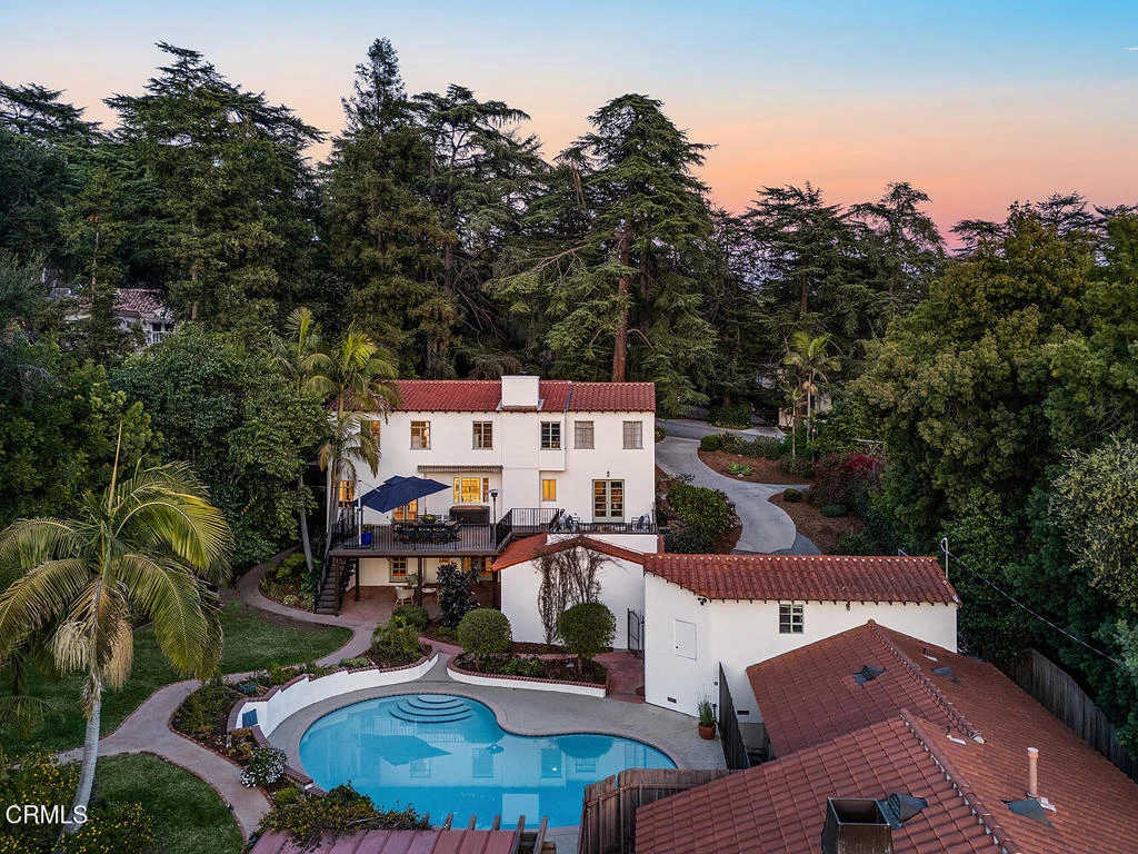 This majestic 1937 Spanish estate set on over 25,000 square feet, seamlessly blends old-world charm with modern luxury. Situated amongst the deodars in the prestige neighborhood of La Canada Flintridge, this immaculate architectural home has been lovingly maintained in pristine condition. This property offers an enchanting retreat with striking architectural details, a private pool, a full ADU and awe-inspiring sunset views. The interior has pitched ceilings, custom woodwork, picturesque windows, and a comfortable floor plan. Step inside and you are allured by a sprawling staircase with elevated ceilings and original tilework. The stunning living room with a statement fireplace, an abundance of natural light and character finishes is the perfect room for holiday gatherings with your loved ones. Adjacent, the dining room is convenient for large family gatherings with doors that expand to a new deck for sweet California living. The inviting gourmet kitchen with breakfast area is charming and functional. A main level bedroom suite has an updated 3/4 bathroom and views of the front yard. The upper level offers three bedrooms and two bathrooms, including the enchanting primary suite featuring spectacular views with a very generous sized closet and inspiring bathroom. A new laundry room completes the upper level. The lower level has generous rooms including a spacious family room, office/5th bedroom, full bathroom, a second laundry room and an abundance of storage. French doors open to a resort-like backyard, where a sparkling pool, charming patio, fireplace and lush gardens create an idyllic space for entertaining. Unwind as the sun sets over the rolling hills, painting the sky with vibrant hues. The Accessory Dwelling Unit with separate utilities faces Palm Drive for ultimate privacy featuring three bedrooms, two bathrooms, kitchen, living room and patio area. The property has four car garages with ample storage and plentiful parking space on the driveway. Experience the perfect blend of Spanish architecture with today's amenities in this extraordinary deodar retreat around the corner from award winning La Canada schools!