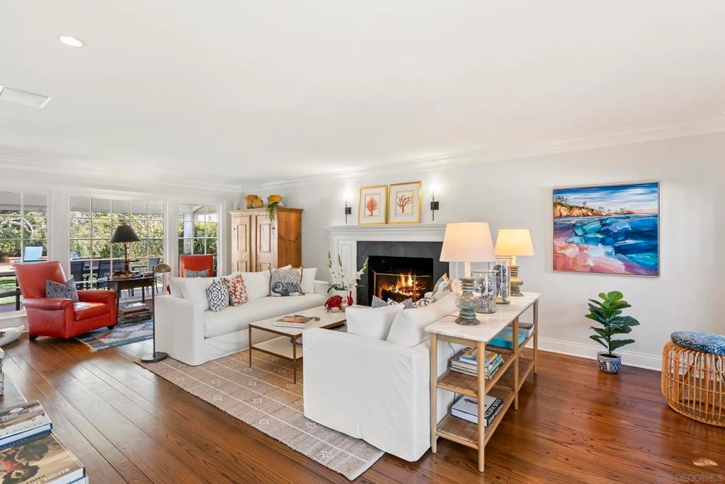 Tucked within La Jolla’s coveted Lower Hermosa neighborhood, this ultra-charming traditional residence presents a compelling opportunity to own a beautifully maintained single-story home in one of the area’s most desirable coastal enclaves. Encompassing approximately 2,289 square feet, the two-bedroom layout features hardwood flooring, fireplaces in both the formal living room and family room, and abundant natural light throughout. A manicured front yard welcomes you into an inviting floor plan with generous living and dining spaces designed for both everyday enjoyment and entertaining. The kitchen connects seamlessly, while a nearby laundry room also functions as a flexible workspace with built-ins and an adjacent enclosed office, providing a quiet, separate area for work or hobbies. The primary suite is spacious and light-filled, boasting a walk-in closet plus additional storage, while the secondary bedroom offers comfortable proportions and natural light. Set on a level 7,500 square foot lot, the backyard affords privacy and scale, framed by mature landscaping and highlighted by a vibrant rose garden, expansive lawn, and a combination of covered and open-air brick patios—ideal for gatherings or relaxed outdoor living. Alley access leads to the attached two-car garage. Set near beaches, the Village, and top-rated schools, this home captures the essence of classic La Jolla living.