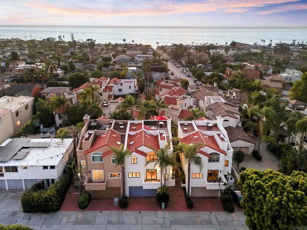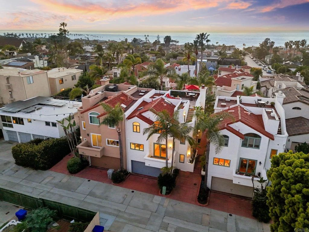 Rare opportunity in Las Casitas, La Jolla — an intimate boutique community where each residence and its lot are individually owned, not a traditional condo. Tucked at the rear of the complex for exceptional privacy, this 3-bedroom, 3-bath home offers interior ocean views from the main living areas and panoramic Pacific sunset views from a full rooftop deck with direct stair access. Soaring vaulted ceilings, five skylights, and hardwood floors create a bright, open living environment. French doors and plantation shutters add architectural character, while two granite-hearth fireplaces — one in the living room and one in the primary suite — bring warmth and refinement. The generous 18x16 primary suite features its own fireplace, a luxurious bath, and a walk-in closet. Two additional bedrooms provide flexibility for guests or a home office. Three distinct outdoor spaces set this home apart: a dining patio ideal for al fresco meals, a large private tropical patio exclusive to this residence — rare in the Village — and a rooftop deck capturing sweeping Pacific sunsets. Together, they deliver the indoor-outdoor lifestyle La Jolla is known for. The kitchen and living areas flow seamlessly through French doors to the outdoor spaces, completing the coastal living experience. A double garage with direct alley access, guest parking, and oversized storage round out the offering. Just steps to WindanSea Beach, Marine Street Beach, La Jolla Village, and The Cove, this rarely available Las Casitas residence represents a premier coastal opportunity.