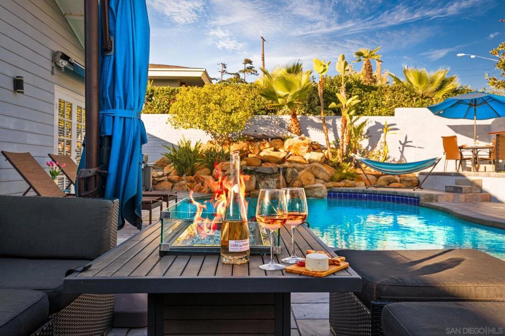 SHORT-, MID- & LONG-TERM FURNISHED RENTAL — Stunning View Estate with Pool & Game Room Panoramic ocean, city, and sunset views define this remarkable single-story hilltop estate in La Mesa. Formerly owned by a celebrity, this expansive 5,600+ sq ft home offers 6 bedrooms, 4 bathrooms, and unforgettable west-facing views from most rooms. Ideal for large families or two families traveling together, the open floor plan allows natural light and scenery to flow seamlessly throughout the living spaces. The home features a spacious living room, family room, and dedicated game room with pool table. The chef’s kitchen is fully equipped with stainless steel appliances, generous pantry space, bar seating, and multiple dining areas including a table for six, island seating, and breakfast nook. Outdoor living includes a saltwater pool with waterfall, propane fire pit, BBQ grill, and expansive patio perfect for relaxing and enjoying San Diego’s year-round climate. A removable pool fence is available upon request. This is not a party house and is best suited for respectful guests. Conveniently located minutes from La Mesa Village and a short drive to downtown San Diego, beaches, and major attractions. Sleeping setup (max 16): Primary CA King; Queen; Two Fulls; Queen; King; Kids room with Twin plus Twin bunk; plus living room sleeper sofa and twin ottoman bed. Rates vary by season and length of stay. Published amounts are estimates; final pricing, fees, and availability are subject to change until a signed agreement. Please inquire for an exact quote.