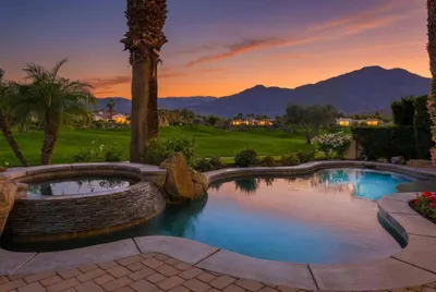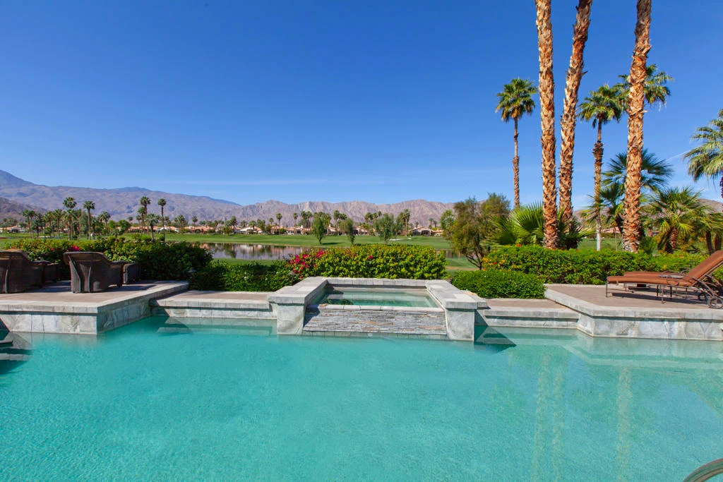 Located within the prestigious gates of Rancho La Quinta Country Club, this exceptional contemporary residence showcases a rare combination of elevated design, premier location, and truly breathtaking panoramic views. Perfectly positioned on an expansive 14,375 sq. ft. cul-de-sac lot, the home captures a coveted southwest exposure overlooking the 15th, 16th, and 17th fairways of the Jerry Pate Championship Golf Course, with two shimmering lakes and the dramatic Santa Rosa Mountain range creating an unforgettable backdrop.Designed to embrace the ultimate desert lifestyle, the outdoor living spaces are nothing short of spectacular. A resort-style setting features quartz stone pool surrounds, an elevated spa with cascading waterfall, and a step-down BBQ and firepit area ideal for entertaining under the desert sky. Two elevated viewing decks provide multiple vantage points to take in sweeping golf course, lake, and mountain vistas, while custom overlay finishes enhance the patio and walkways. A detached guest casita offers privacy and comfort for visitors.A private courtyard entry leads to striking dual wood and etched glass doors, opening to a custom foyer with detailed flooring and a sophisticated, light-filled interior. Tall ceilings and expansive windows frame the views, while travertine stone flooring, base moldings, and quality raised-panel solid core doors add timeless elegance throughout. The great room is anchored by a romantic fireplace, echoed in the luxurious primary suite for a warm and inviting ambiance.The open-concept cook's kitchen is designed for both everyday living and entertaining, featuring refinished cabinetry, granite countertops, stainless steel appliances, a warming drawer, wine refrigerator, trash compactor, and a walk-in pantry. Custom window coverings--including electronically controlled blinds and wood shutters enhance both style and functionality.All guest bedrooms are generously sized and ensuite, offering comfort and privacy. The primary suite is a serene retreat with direct access to outdoor living areas, while the spa-inspired bath showcases refinished cabinetry, a large walk-in shower, and stunning Dolomite-like-veined stone countertops. A custom walk-in closet with built-ins completes the space.Additional highlights include a spacious three-car garage with built-in storage and epoxy flooring, a large paver driveway, and meticulous attention to detail throughout.
