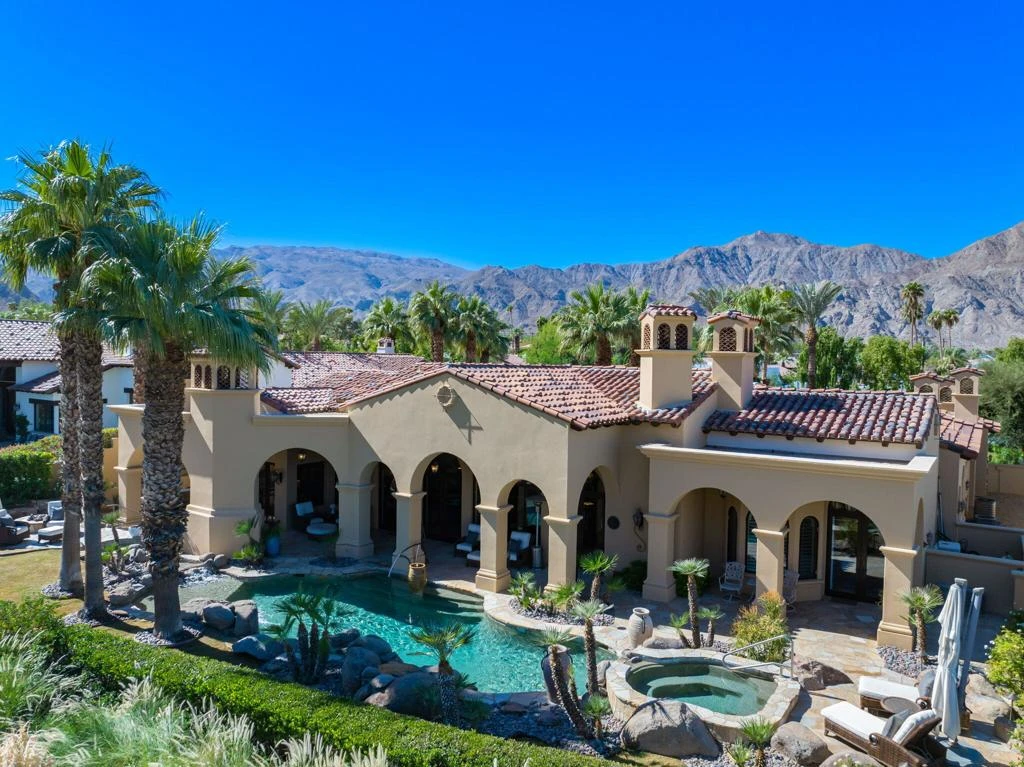 Panoramic mountain and fairway views from one of the best lots in Tradition! The impressive entrance is like no other. Enter through handsome Iron gates into an expansive courtyard with architectural features and behold a magical view of the Santa Rosa Mountains. This light and bright home has everything you could imagine including a formal dining room, wine cellar, dual offices (4th bedroom set up as office with queen murphy bed), radiant heat, central vacuum system and much more. The perfect family home with 4 bedrooms including a casita with living room. Highest quality finishes, rich millwork and craftsmanship throughout, including hewn hardwood beams, gorgeous natural stonework & gourmet kitchen with premium appliances. Luxurious primary suite with cozy fireplace and sumptuous bath with dual vanities, dual closets, warming towel drawer, beautiful shower and jetted soaking tub. Located on the 12th fairway with stunning pool, flowing stream, built-in BBQ, and outdoor dining. Multiple outdoor spaces make idyllic settings for upscale social gatherings or private relaxation and blend seamlessly with the interior. Indoor and outdoor Sonos sound system included. There are two outdoor fireplaces and a fire pit. Welcome to a lifestyle of luxury, comfort and elegance at Tradition. Built by one of the Desert's finest contractors, Cal-Tech Development, this home is offered furnished per inventory.