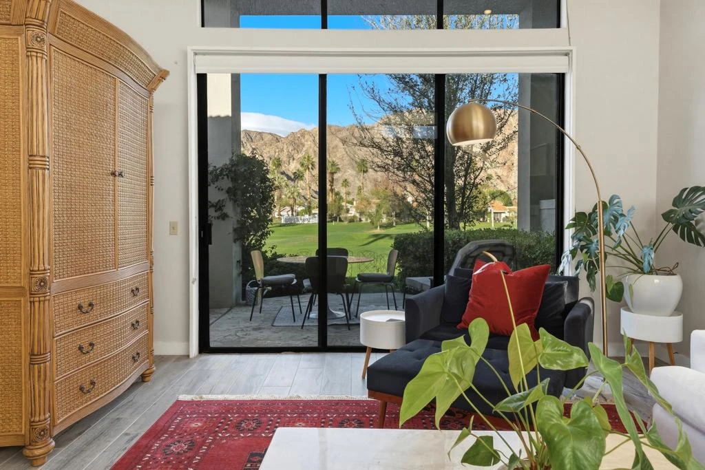 One of the best views in all of PGA West! Two bedroom, two bath, approx. 1,330 sq. ft. Sophisticated casual home with stunning design. Features lovely courtyard entry, living and dining great room space with high ceilings and windows that bring in the desert's natural sunlight. Spacious kitchen with new stainless appliances and new granite countertops. Large primary suite with double vanity bath and great views, plus another inviting guest room with ensuite bathroom access. The many perfect upgrades include new designer paint, porcelain tile plank flooring, high grade carpeting, and designer Hunter Douglas blinds. Enjoy dining on the back patio on the highly desired tee box of the eighth hole on the Palmer Private Course. Ideal location with gorgeous mountain and golf course views for breathtaking sunrises and sunsets. Offered partially furnished per inventory. No golf balls/ No golf cart path