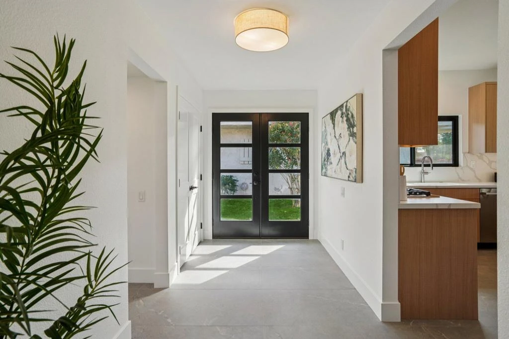 A stunning modern desert retreat, completely reimagined from top to bottom, this exceptional residence in Lago La Quinta offers beautiful south-west-facing views of Santa Rosa Mountain. This home has been transformed by leading Southern California designers, with every surface and system thoughtfully upgraded to deliver a cohesive, high-end result. Interior improvements include all-new 24x48 Anthea Grey porcelain flooring throughout the main living areas, plush Dreamweaver carpeting in all bedrooms and closets, solid-core Shaker-style interior doors, custom-designed closet systems, new recessed LED lighting with designer fixtures, and brand-new Milgard sliding glass doors and windows. The fully redesigned kitchen features custom white oak Cleaf cabinetry with soft-close drawers and pull-outs, a complete stainless steel LG appliance suite including double oven and gas range, honed quartz countertops, and a full-height matching backsplash. The living room is anchored by a dramatic floor-to-ceiling porcelain-tile fireplace wall with a new lava-ball gas insert, complemented by custom built-ins with floating shelves, wine storage, and a KitchenAid wine-and-beverage refrigerator. All three bedrooms are spacious en-suites with spa-inspired bathrooms featuring custom double vanities, walk-in showers, and extensive built-in storage, while the primary suite includes a custom dressing area, built-in dresser, luxurious soaking tub, and walk-in glass shower. Additional upgrades include a new 3-ton Goodman HVAC unit, new Therma-Tru front and patio doors, updated landscaping with new plantings and drip irrigation, and a septic system improvement completed in 2024, including a new seepage pit, providing added peace of mind for future ownership. The guest bedrooms and main living area are thoughtfully arranged around a private interior courtyard, creating an additional outdoor living space with exceptional privacy. The two-car garage includes a dedicated golf cart space with its own separate driveway. Located within Lago La Quinta, a private gated enclave of 72 homes featuring three community pools and spas, tennis/pickleball courts, and set alongside the renowned La Quinta Country Club, this home delivers timeless modern design, thoughtful craftsmanship, and effortless luxury just minutes from Old Town La Quinta, world-class golf, dining, and resort living. Call to see this one in person!