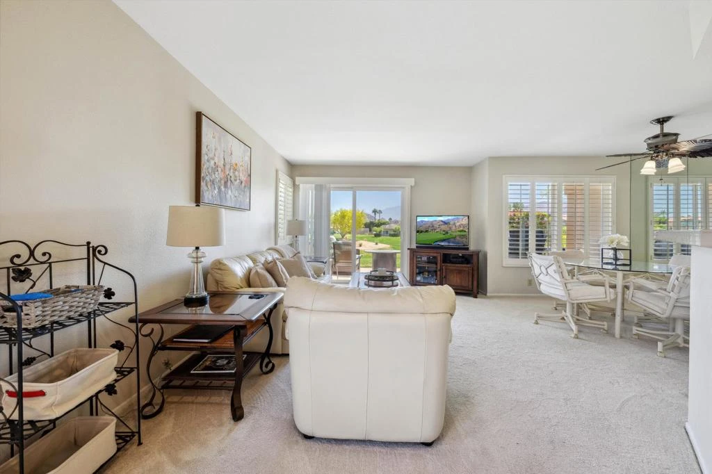 Chic End-Unit Condo with Mountain Views & Resort Amenities Welcome to your dream vacation or primary home! This beautiful end-unit condo offers privacy with no neighbors above. Why rent when you can own for the same payment as renting. Surrounded by lush greenery and stunning south-facing mountain views. Open & Inviting Living Spaces Seamless flow between kitchen, dining, and living areas--perfect for entertaining or relaxing. Dining area features plantation shutters, a ceiling fan for breezy comfort, and a stylish barstool counter. Spacious Bedrooms & Modern Upgrades Vaulted ceilings and roomy closets in both bedrooms.Primary suite with queen bed, updated en-suite bath (2024), and in-unit laundry with LG washer/dryer behind a trendy barn door. Recent upgrades: refrigerator, microwave, dishwasher, AC, windows, and sliding doors--all new in 2024. Outdoor Living & Community PerksPrivate patio for relaxing or grilling.High-speed WiFi and internet included in HOA dues. Unlimited golf on a Par 3 walking course designed by Ted Robinson.Prime Location Across from Indian Wells Tennis Gardens (home of the BNP Tennis Tournament).Close to world-class golf, shopping, dining, and free local attractions. Motivated seller.