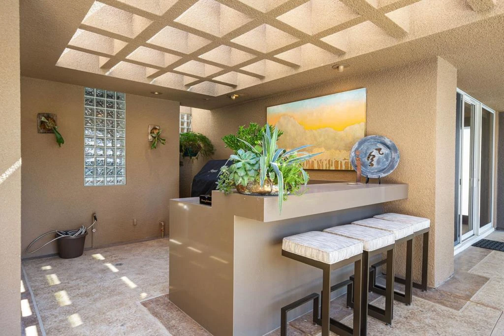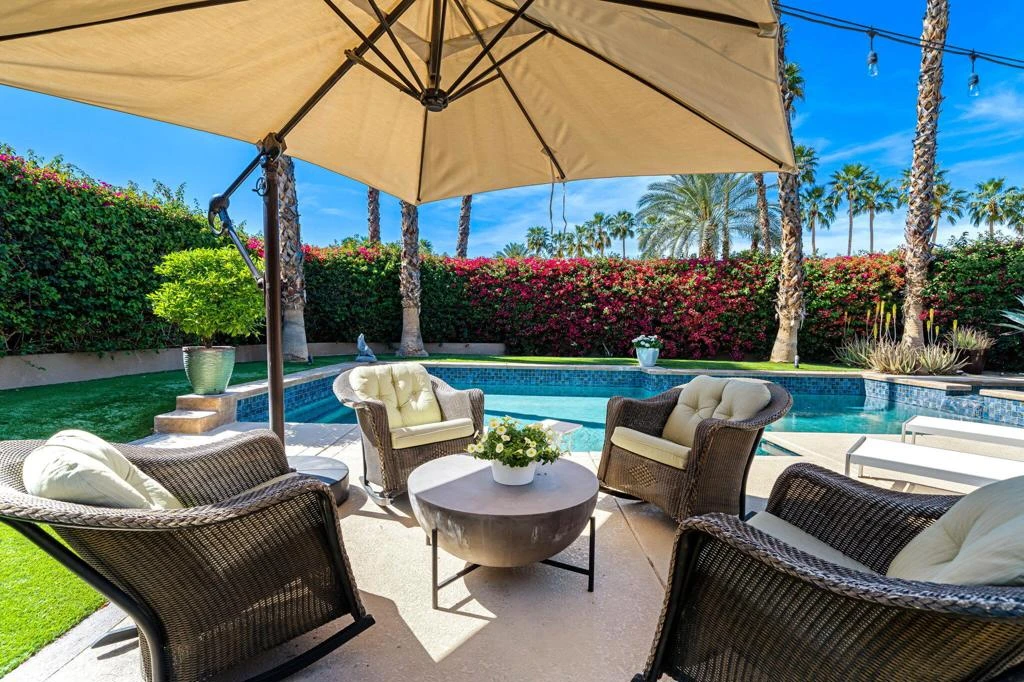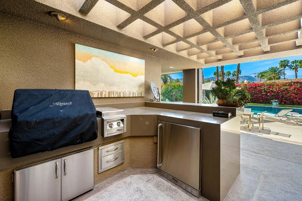 Available for May 2026-October 2026.Experience elevated desert living in this exquisite 4 bedroom contemporary estate, thoughtfully designed for refined relaxation and effortless entertaining. A dramatic 10 foot wall of glass doors and windows creates a seamless connection between indoor and outdoor living, filling the home with natural light while opening to spectacular resort style surroundings.Set on beautifully manicured, park like grounds, the property offers an exceptional private retreat. The expansive outdoor living space features a fully equipped outdoor kitchen perfect for preparing and enjoying al fresco dining while overlooking the lush landscape. A private detached casita enjoys views of the sparkling pool and vibrant gardens, offering guests a serene and luxurious escape.Inside, sophisticated finishes and elegant flooring flow throughout the residence. The gourmet chef's kitchen is appointed with stunning quartzite countertops, an oversized center island, and an inviting breakfast nook ideal for both casual mornings and stylish entertaining. The primary suite serves as a luxurious sanctuary, showcasing breathtaking mountain views and a spa inspired bathroom designed for ultimate comfort and relaxation. Guest bedrooms are thoughtfully positioned on the opposite wing of the home, ensuring exceptional privacy for family and visitors alike.Ideally located in the heart of La Quinta, this remarkable residence places you just moments from world class golf courses, scenic hiking trails, fine dining, and upscale shopping while still offering a peaceful, private setting to fully embrace the desert lifestyle. Weekly housekeeping service is included, providing the ultimate in convenience for this exceptional luxury vacation rental.