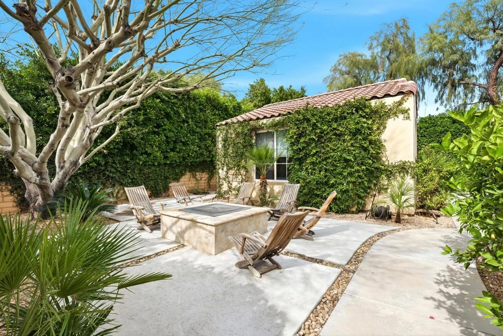 Fabulous Desert Cove Entertainer. Private Quarter Acre Oasis with Resort Living. Don't miss this exceptional opportunity to own a stunning Desert Cove home designed for effortless indoor outdoor living on a rare and highly desirable quarter acre lot. Surrounded by mature landscaping and exceptional privacy, the property feels like your own secluded oasis while still being less than six minutes from town, dining, and shopping. Located in one of La Quinta's lowest HOA gated communities, you will enjoy security, value, and peace of mind. Offering five bedrooms and five bathrooms, the home includes four bedrooms in the main residence plus a spacious detached casita that is ideal for guests, multigenerational living, or a private retreat. Inside, tile flooring flows through the main living areas with updated waterproof laminate flooring in all bedrooms and the casita. LED lighting, soaring 10ft ceilings, and an open great room create a bright and welcoming atmosphere. The space is anchored by a custom stone surround fireplace, expansive windows, and sliding glass doors that connect seamlessly to the backyard. The family style kitchen is perfect for gatherings and features an oversized island, GE Profile stainless steel appliances, double ovens, built-in microwave, beverage cooler, filtered water system to the sink and Samsung refrigerator, plus a French door leading outdoors. A charming breakfast nook with sliding doors opens to the side yard for relaxed mornings and evening breezes.The primary suite offers a peaceful retreat with dual closets, a soaking tub, glass enclosed shower, dual vanities, a towel warmer, and direct access to the pool terrace.Step outside to the private courtyard with a custom Breeo hardwood cooking fire pit and grill, creating the perfect setting for memorable dinners under the stars.The resort style backyard, features a custom pool and spa (installed in 2020) with a tanning shelf, bond beam, two water features, Pentair WhisperFlo pump, saltwater system, Pentair MasterTemp heater, WiFi app automation, LED color changing lights, a custom gas fireplace, extensive concrete decking, sidewalks, and professional landscaping with exterior LED lighting. The oversized lot provides space, serenity, and privacy that is rarely found in the neighborhood. Additional highlights include a three car garage. The double garage is finished with epoxy flooring, and the third garage features laminate flooring and offers flexible space.