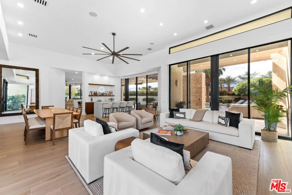 Welcome to paradise! Newly remodeled and just newly furnished custom 5 bed/5.5 bath Contemporary home located in the exclusive The Estancias gated community of only 49 custom properties in prime La Quinta location, close to Old Town, La Quinta Resort & some of the desert's finest world-class golf courses. Situated on a large 28,000+sf lot with private gated driveway, this home exudes the resort lifestyle with incredible indoor/outdoor flow, stunning modern designer finishes throughout and entertainer's backyard. Main home includes 3 bed/3.5 bath with detached 2 bed/2 bath casita (with fireplace, breakfast bar & fridge) located off of the home's inviting center interior courtyard featuring a beautiful spa and tranquil waterfall. Formal entry with powder room opens to spacious living room with entertainers bar & dining table for 10. Large family room opens to breakfast room & open chef's kitchen with quartz countertops, center island with waterfall edge & breakfast bar and walk-in pantry. Living room & family room all opening to relaxing beautifully landscaped backyard including covered patio with misting system, newer patio seating areas, fire pit, lounge chairs, built-in BBQ and Pizza oven and incredible over-sized sparking pool all overlooking beautiful mountain and sunset views. Primary suite has a separate wing off living room with fireplace, walk-in closet, gym that includes Peloton and spa-like primary bathroom with separate bath/shower. Additional features include porcelain wood-like tile throughout the home, 4-zoned ac/heat, newly installed 75" & 85" televisions and Sonos sound system throughout, ceiling fans in every room, all bedroom with ensuite bathroom and full-size laundry room with sink. Price may vary depending on month.