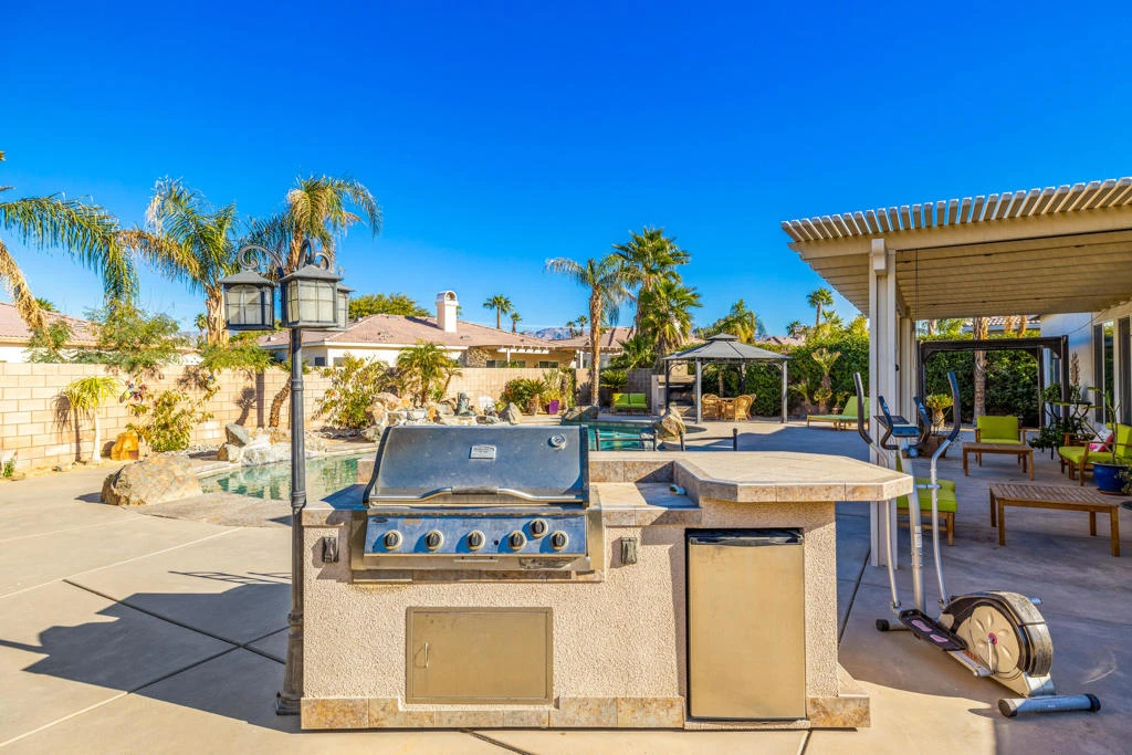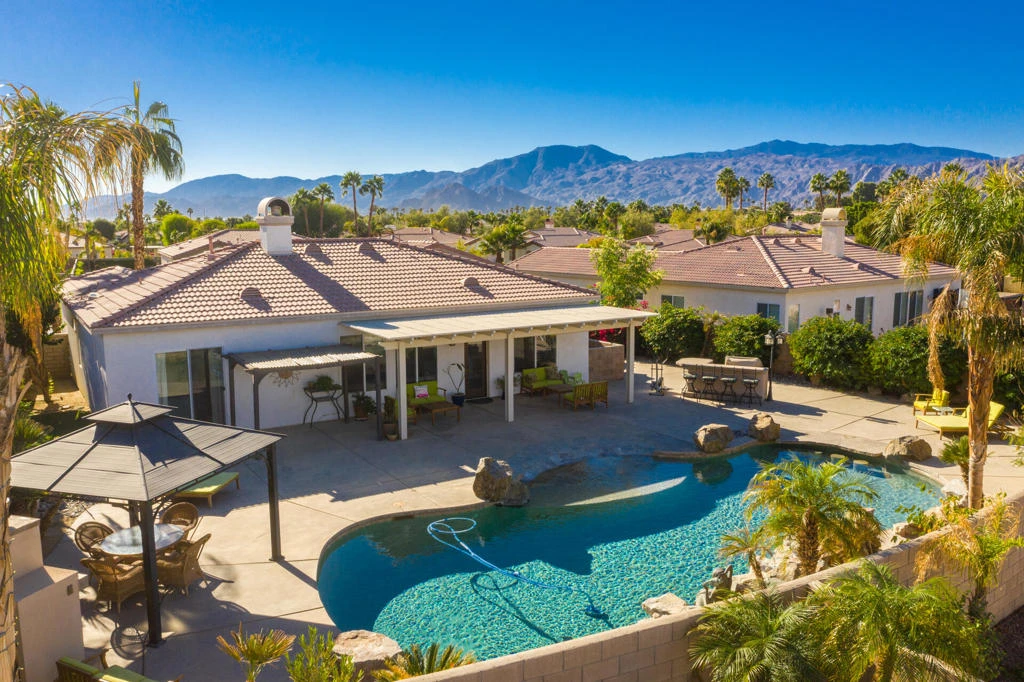 Seasonal is 6500.00 Sept- Dec $4500.00 This beautiful 3 bedrooms Plus den pull out couch. 3 bath home is located heart of La Quinta. The house is turnkey with everything you need to vacation. Open floorpan w/tile through out. In the backyard it has an outdoor Fireplace w/gazebo. Gorgeous, large custom salt water pebble tec pool with waterfalls is the centerpiece, flanked by a generous sized BBQ island, gazebo and gas fireplace! All surrounded by the backdrop of stunning mountain views! Gated community close to shopping, golf and award winning Dining! Just pack your bags and book your stay.
