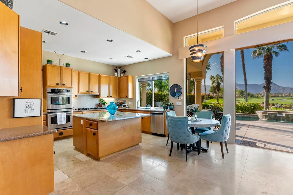 Mountain and Lake views! This desirable south west facing Encanto 1 home has views that seem to go on forever! The upgrades and additions create your own private resort with 3 bedrooms, (all king beds) and ensuites. The beautifully furnished and comfortable great room comes complete with built in bar and large screen TV. A well-appointed chef's kitchen, includes an island for food preparation. The beautiful back yard with pool and spa showcases a relaxing lifestyle overlooking three holes of the Steve Pate course. Relax and unwind on your expansive deck while views of the Santa Rosa mountains wash your cares away! This beautiful home has been meticulously cared for by its owners. Utilities are capped at $250. per month. Includes wifi and cable TV! Please call for available dates!