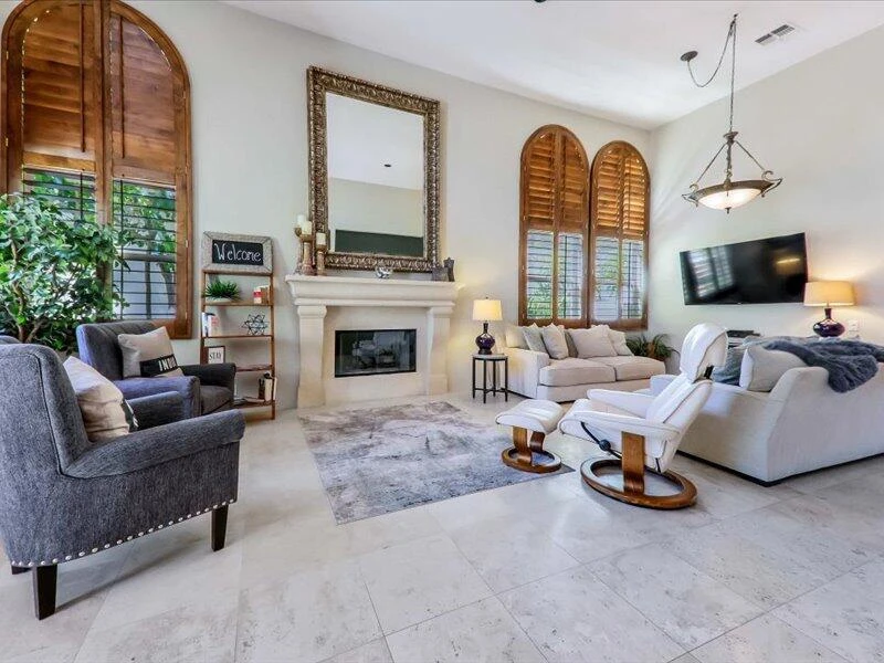 Welcome to your gorgeous pool home in beautiful Rancho La Quinta Country Club. This west-facing home situated on the Pate course with double fairways has striking Santa Rosa Mountain views! This Encanto 2 floor plan includes a detached Casita (2 bedrooms in main home plus 2 in Casita) and a beautiful main house with high ceilings. Enter this exceptional property through a slate tiled front patio with fountain to a custom front door. You enter the open concept floorplan home to a large living room. The kitchen has granite countertops and stainless-steel appliances along with a large island with barstools plus separate dining area. The family room has a large fireplace across from floor to ceiling windows overlooking the pool area. The primary bedroom looks out onto the pool area and has a large walk-in closet and a stunning bathroom with glassed in shower and separate spa tub. There is also one extra bedroom with flat screen television in the main house. There are two bedrooms in the detached casita. Outdoor living area boasts a lovely salt water, pebble-tech pool/spa with water feature, built-in BBQ and plenty of seating. Rate varies depending on month.
