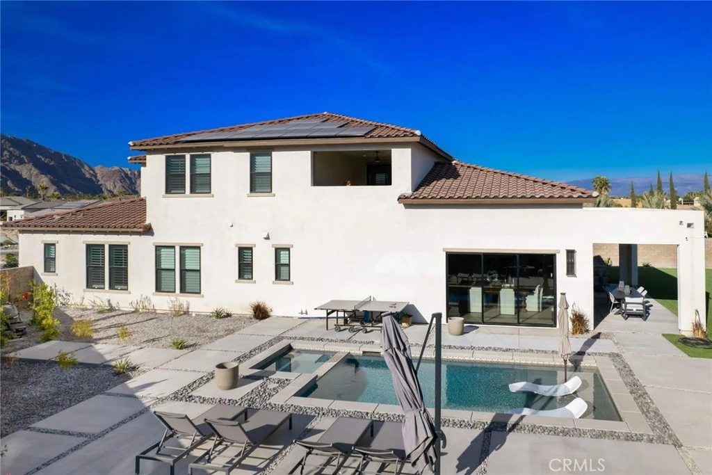 Fully furnished newly built home in the prestigious gated community of Stone Creek Ranch. This model home comes furnished and features 5 bedrooms, 5 bathrooms, office and theater room. The master bedroom is located on the first floor with a luxurious master bathroom with a soaking tub with an oversize shower. The living and Dining room boast over 20 ft ceilings with wood floors and sliding doors leading to the amazing entertainer's yard with a saltwater pool and spa, built-in bbq grill and outdoor fireplace with spectacular views of Coral Mountain. This home is just a few minutes to PGA West and Greg Norman public courses, and Coachella and Stagecoach festivals.