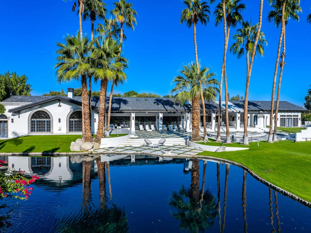 Unsurpassed estate on nearly two acres at La Quinta Polo Estates! Six bedrooms, seven and a half baths, including guest house. Approx. 9,200 sq. ft. on 1.99 acres. Privately gated, circular driveway leads to a towering portico and elegant formal foyer. Step into the imposing great room with fireplace, beautiful floor to ceiling art displays, French doors and custom wet bar. Right off the great room is an inviting den/media room for informal gatherings. The Gourmet kitchen with gorgeous center island is a cooks dream and features a cozy morning room. Further, there is a family room with fireplace, and a formal dining room for effortless entertaining! The impressive primary suite is a true retreat, featuring dual sitting rooms with fireplaces, and luxurious his & hers baths. Follow a meandering path to the detached one bedroom guest house, highlighted by cozy a living room with fireplace and full kitchen, affording your guest complete privacy. There is a lovely outdoor entertainment area with fireplace, firepit and dining area for those warm desert nights. Jaw dropping, park-like grounds boast custom pool & spa with waterfall, regulation sized tennis court, a large private lake, fountains and fruit trees. This is a truly special estate, your own private Oasis! This home has been extensively updated and upgraded and is offered furnished per inventory!