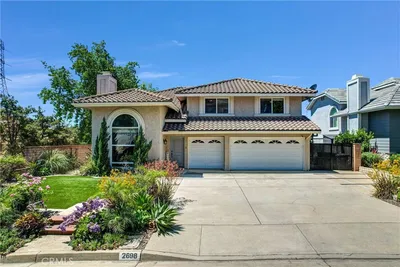 Tucked behind the gates of La Verne Heights, this thoughtfully remodeled residence blends refined interiors with a resort-style outdoor setting. Layered stonework, accent lighting, and hardscape walkways guide you through a private courtyard to a covered, arched entry with custom double doors. Inside, a two-story foyer sets the tone with an arched transom window, chandelier, wide-plank LVP flooring, and crown molding throughout. A staircase with a mid-landing, wood handrail, and dark metal balusters adds architectural presence. The living and dining rooms are filled with natural light, with the dining space highlighted by a modern chandelier and oversized mirror. The kitchen opens seamlessly to the family room and features Corian countertops, warm wood cabinetry, a glass tile backsplash, and stainless steel appliances including double ovens, gas cooktop, and built-in microwave. A center island with bar seating and pendant lighting anchors the space, while the breakfast nook—framed by multiple windows and a glass door—offers direct access to the backyard. The family room centers around a stacked-stone fireplace with built-in media cabinetry and views of the outdoor living areas beyond. The main level is completed by a private office or optional fourth bedroom, a full bathroom with walk-in shower, and an indoor laundry room with sink and storage. Upstairs, an expansive bonus room with vaulted ceilings and recessed LED lighting provides flexible use as a media room, game room, or secondary living space. The primary suite serves as a private retreat, featuring crown molding, plush carpet, abundant natural light, and an adjoining sitting area with gas fireplace. The spa-inspired primary bath includes dual vanities with granite countertops, a dedicated makeup station, a soaking tub beneath a large window, and a glass-enclosed walk-in shower with custom tile work. Two additional upstairs bedrooms are generously sized and share a well-appointed hall bath with dual sinks and a subway-tile tub/shower combination. Outdoors, a resort-style pool and raised spa with cascading water features and integrated lighting anchor the private backyard. Gated RV parking and tall, mature hedges surround the property, creating a secluded setting. Custom square-cut concrete hardscape defines multiple entertaining zones, including a covered Alumawood patio with lighting, built-in seating and fire pit, outdoor surround sound, and a built-in BBQ with grill and bar seating.