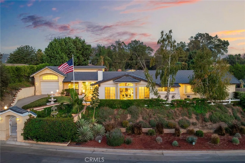 Sprawling single story home situated on an elevated lot with a gated driveway. A manicured front yard with steps leads to a beautiful herringbone brick courtyard and the front entry door. The front door opens to a tiled foyer and to an spacious living room with open beam vaulted ceilings, picture windows overlooking the front yard, a fireplace with river rock surround, and an adjacent formal dining room just steps from the kitchen. The remodeled kitchen is oversized and offers rich wood cabinetry, top-of-the-line stainless appliances including double ovens, dual warming drawers, two refrigerators, and dishwasher drawers. The large center prep island with butcher block counters and a sink centers the kitchen's cooking area and is lit with pendant lighting. A peninsula also open to the kitchen, offers countertop seating and backs up to the large breakfast nook offering a custom fireplace, built-ins, and exposed beam ceilings. Step into the family room featuring tiled flooring, a full wall with a built-in media center, recessed lighting, surround sound, and windows overlooking the front yard. A show stopping custom built bar features plenty of seating, beautiful craftsmanship, a coffered ceiling with copper inlay, a refrigerator, glass shelving and an adjacent pool table with a hanging pool table light. The primary bedroom down the hall offers a fireplace, built-ins, a retreat with a built-in media center, vaulted ceilings, and French doors to the backyard. The ensuite primary bathroom offers a sink with plenty of countertops and storage space plus a shower/tub. There are three additional bedrooms downstairs, one with a built-in wet bar and patio, and one with an ensuite bathroom perfect for an in-law living quarters set up. Upstairs there is an open studio like room with an enclosed patio offering nice views. The attached tandem garage could hold up to four cars and there is a workshop adjacent. The backyard features artificial turf, two covered patios, a koi pond, a fire pit, and two additional structures. The barn offers a workshop area, a room used as a second entertainment room, and a chicken coop. The chicken coop extends to an outdoor area as well and the barn backs up and opens to the bridal path directly behind the property. The second detached structure is a redwood cabin, cozy inside but has a small room and a sitting room with a fireplace. The Boral concrete tile roof and PEX plumbing were recently installed and are still under warranty. Zoned A1