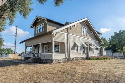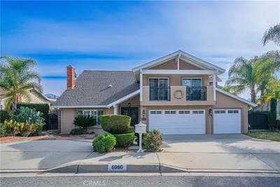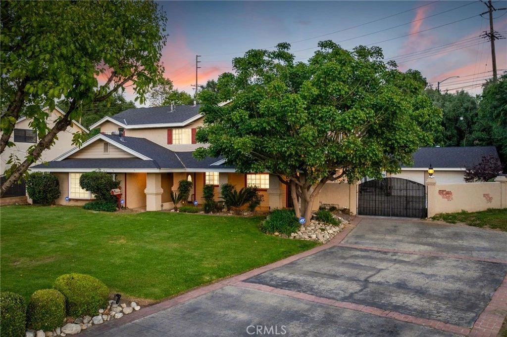 Welcome to your idyllic private oasis in La Verne, nestled on an expansive lot with no side or rear neighbors, offering unmatched seclusion and serene views. This stunning residence boasts a resort-style backyard and a charming brick-ribbon driveway with gated entry to a spacious parking courtyard, complemented by a detached, extra-deep two-car garage. A sprawling covered front porch, framed by vibrant planters and rock gardens, welcomes you to a tiled entryway. To the right, an open kitchen overlooks the front yard, featuring warm maplewood cabinetry, sleek Corian countertops, stainless steel appliances, space for a separate refrigerator and freezer, a cozy breakfast nook, and a convenient breakfast bar. The adjacent formal living and dining room exudes sophistication with a floor-to-ceiling brick fireplace, rich hardwood floors, and seamless access to the family room. The family room, adorned with tiled flooring, a striking brick niche with a wood-burning stove, a wall of windows, and French doors, opens to the breathtaking backyard. A versatile bonus room with hardwood floors, another floor-to-ceiling brick corner with a wood-burning stove, and a bay window adds charm and functionality. The main level also includes a bedroom, a 3/4 bathroom, and an oversized laundry room. Upstairs, the expansive primary suite is a tranquil retreat, bathed in natural light from multiple windows, with new carpeting, dual ceiling fans, and a luxurious en-suite bathroom. The bathroom features tiled flooring, white cabinetry with dual sinks, recessed lighting, a wall of mirrored closet doors, a walk-in shower with glass enclosure, and a separate soaking tub. Four additional bedrooms, one with balcony access, a full hall bathroom, and a dedicated office with balcony overlooking the pool and backyard complete the upper level. The backyard is a true entertainer’s paradise, featuring a sparkling pool and spa, a covered patio, a built-in barbecue with seating and a fridge, a custom wood pergola with concrete radius seating, and a poolside cabana with a fire pit and paver decking. Manicured landscaping, mature trees lining the property for privacy, and a covered dog run enhance this outdoor haven. This home is equipped with solar power, assumable lease transferable to the new owner. With its blend of luxury, privacy, and resort-like amenities, this La Verne masterpiece is ready to become your forever home.