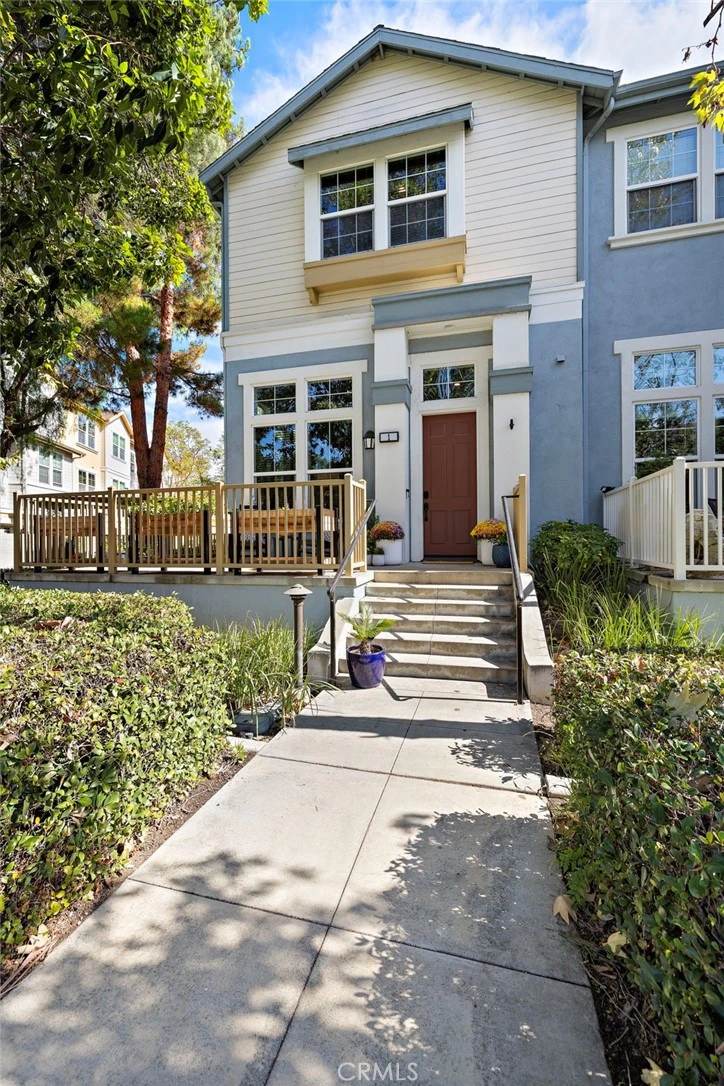 Beautiful model-like, end location with large windows and natural light pouring into the home. No neighbors on the right side. This wonderful layout (Briar Rose, model plan 3) model plan 3) is an open design with a wrap-around porch, 3 bedrooms, 2.5 baths, and oversized 2 car attached garage, including a separate, huge storage space AND a driveway! This home is an entertainer's dream. This impeccably renovated home also boasts a FULL driveway. You'll find a large gourmet chef and entertainer’s dream kitchen, fully upgraded, large island, granite countertops, tile backsplash, pendant lights and newly painted cabinets that opens up to the spacious family room. This home features brand new hardwood floors throughout, cathedral vaulted ceilings, upgraded tile flooring in bathrooms and laundry, tall baseboards, crown molding, encased windows, designer paint, and is re-piped. This home has all of the details, including a custom built-in entertainment center, pass-through fireplace, surround sound, smart Wifi controlled lighting, a smart thermostat, keyless entry, a Ring doorbell system, a new HVAC system, and a freshly renovated garage with beautiful epoxy floors and plenty of space for storage. The inviting master bedroom is complete with hardwood floors, designer paint, wood blinds and a large walk-in closet with built-in shelving. Both upstairs secondary bedrooms are generously sized and feature hardwood flooring and designer paint. This home is located just steps away from a park, pool, and covered playground, as well as the Ladera Ranch Paseo and Celestial Plunge. The privacy of a corner unit combined with a view of the greenery across the street makes this the perfect location. You won't want to miss this immaculate, one-of-a- kind home!