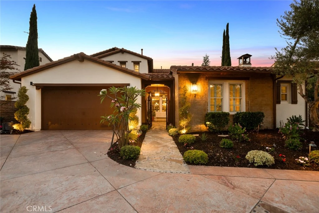 Panoramic evening light, sunset and valley views provide an ever-changing backdrop for luxury living at this ideally positioned Ladera Ranch estate. Located in Alisal at the end of a tree-lined cul-de-sac street behind the guard-gated entry of Covenant Hills, the home reveals its outstanding interaction with outdoor living spaces. Guests are welcomed beyond a custom arched trellis, down a long custom-finished driveway, and through a gated entry courtyard with enchanting tile wall feature. Indoors, a quest for ageless design that transcends trends and grows richer over time is immediately apparent. A rotunda foyer with inlaid tile medallion flows effortlessly to a formal living room with stone fireplace, and a formal dining room with built-in cabinetry and French doors leading to a private fireplace-warmed courtyard. Approximately 4,442 square feet, the impressively sized residence showcases a family room with fireplace, courtyard access and a seamless transition to the professionally upgraded kitchen, where new heights of culinary perfection are easily reached. Enjoy a generous island with seating, extensive white cabinetry including a built-in pantry in the breakfast nook, quartz countertops with full backsplash, a French door to the backyard, and a full suite of stainless-steel Viking appliances, including a double oven, built-in refrigerator and a six-burner cooktop with grill and matching hood. Five ensuite bedrooms and five- and one-half baths include a casita with separate entrance. The main-floor primary suite presents panoramic views, French doors opening to the backyard, and a large walk-in closet. Rivaling premium hotels, the primary bath hosts a jetted tub, separate shower, individual vanities & picture-frame mirrors. A secondary ensuite bedroom w/ view balcony awaits upstairs, where an oversized bonus room features a built-in media center and a walk-in kitchen with wet bar, granite countertops and Viking appliances. Hardwood flooring, luxurious high-end carpet in select living areas, dramatic archways, plantation shutters, upgraded lighting fixtures, and custom crown molding lend an air of sophistication throughout the residence, which also features an attached three-car garage. Gorgeous views complement a reimagined backyard, where a spa, custom walk-in BBQ bar, water-saving turf & tiled patios enhance outdoor entertaining. Covenant Hills’ private clubhouse, miles of scenic trails, & top-rated schools are just moments from home.