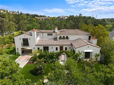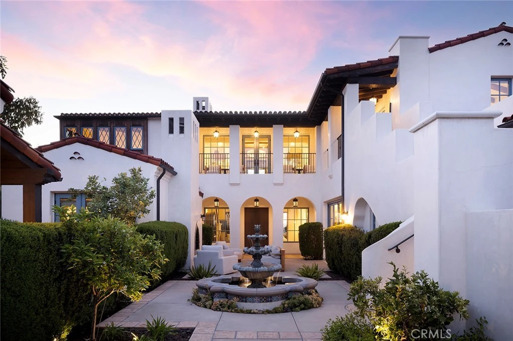 A masterpiece of craftsmanship and sophistication, this one-of-a-kind Spanish estate graces the coveted guard-gated community of Ladera Ranch’s Upper Covenant Hills. Designed by the acclaimed architect behind Rancho Valencia Resort, this custom home occupies a rare, highly-positioned lot on a serene double cul-de-sac, offering unobstructed panoramic sunset views of rolling hills and refreshing coastal breezes. A gated, sun-drenched courtyard warmly welcomes guests, where a charming garden with fruit trees, custom fountain, and striking outdoor fireplace create an inviting first impression. Inside, approximately 5,282 square feet of refined living space seamlessly blend grandeur and intimacy, creating a true indoor-outdoor sanctuary. The expansive great room captivates with its intricately inlaid wood ceiling, handcrafted Mexican terracotta tile flooring, statement fireplace, and dramatic wall of La Cantina glass doors, dissolving the boundary between indoors and out. Thoughtfully designed for both beauty and function, the chef’s kitchen is appointed with premium Thermador appliances, walk-in pantry, custom cabinetry, and a spacious dine-in and seating area —perfect for casual mornings or sophisticated entertaining. Downstairs, three generously sized bedrooms with en-suite baths offer both privacy and comfort. Upstairs, a dramatic staircase with custom hand-forged wrought iron railings leads to the crown jewel: a serene primary suite featuring a vaulted ceiling, spa-inspired bath with modern porcelain tile, freestanding tub, multi-head steam shower, dual vanities, and a private balcony showcasing breathtaking panoramic sunset views and coastal breezes. A second oversized bedroom suite with dual-vanity en-suite bath and a versatile media room with kitchenette and balcony further enhance the gracious upstairs spaces. Completing this exceptional home are elite amenities, including a two-car garage with EV charging, a third garage currently used as a workout room, tankless water heaters, whole-house audio, upgraded lighting, wide-plank oak flooring, and leased solar. Covenant Hills offers exclusive access to a private clubhouse and pool, miles of scenic trails, a putting green, parks, and pools ensuring a luxurious, resort-inspired lifestyle.