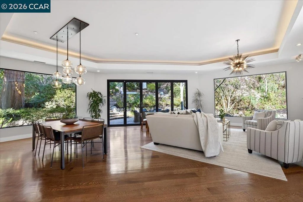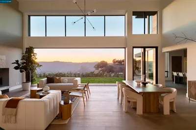 A striking contemporary estate celebrating California’s indoor-outdoor lifestyle, marked by architectural presence and modern elegance. Soaring ceilings, hardwood floors, designer lighting, and expansive glass elevate its sophisticated design. The formal living room features a gas fireplace, tray ceiling with cove lighting, hurricane sliding doors, dining area, and wine closet for approx. 200 bottles. The gourmet kitchen offers Thermador appliances including six-burner range, double ovens, dual Bosch dishwashers, prep sink, expansive island, soft-close cabinetry, under-cabinet lighting, and bay-window nook with garden views. The family room includes a gas fireplace, custom built-ins, and patio access. Bedrooms include a Jack and Jill suite, versatile bedroom with built-ins, and private wing with guest suite. The primary suite offers its own fireplace, patio access, walk-in closets with custom organizers, and spa-style bath with double vanity, freestanding soaking tub, dual shower heads, and bidet features. Resort-style grounds showcase an infinity-edge Pebble Tec pool and spa with cascading water and slide, patios, paver walkways, outdoor kitchen, fireplace, sport court, greenhouse, and mature redwoods. Ideally located just minutes to town, commute routes, and top-rated schools.