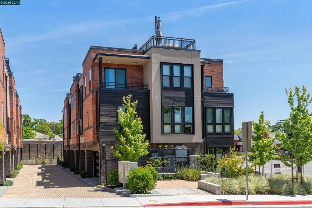 Experience modern comfort in this stylish 3-bedroom, 2.5-bath brownstone-style townhome, located in one of Lafayette’s most conveniently situated neighborhoods. Designed with a sleek, industrial edge, this naturally bright home features an open-concept layout with engineered hardwood flooring, quartz countertops, stainless steel appliances, and energy-efficient dual-pane Andersen windows throughout. The main level offers a spacious, flowing living area connected to a contemporary kitchen with generous counter space—ideal for gatherings. Upstairs, two bedrooms feature en suite bathrooms, including a well-appointed primary suite with dual sinks and two walk-in closets. Additional highlights include a two-car garage with extra storage and a private rooftop deck with panoramic views—perfect for relaxing or entertaining. This home is located close to a wide range of amenities, including dining, grocery stores, BART public transit, and trails.