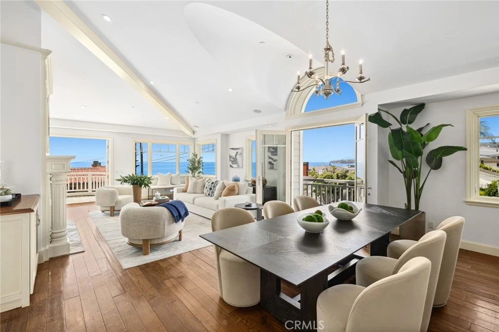 Panoramic ocean, whitewater, north-coast city-light, and Catalina sunset views fill almost every room of this luxurious Laguna Beach home with an enchanting ambiance that redefines the magic of indoor/outdoor living. A prime second-row corner homesite offers an exceptional location in Laguna Village that boasts a rare opportunity to indulge in oceanfront living without the oceanfront price. Uniquely positioned just a few yards from the beach, the New England Coastal-style residence enjoys an unobstructed vantage point that feels like a front-row setting and provides a relaxing and sophisticated lifestyle. Extending approximately 3,660 square feet and home to three ensuite bedrooms, five baths, and flex space for an additional bedroom, the extra open and bright design is bathed in an abundance or natural light and maximizes ocean views. The main level generously caters to entertaining in one vast open floor plan that includes an elegant fireplace and a professional-grade designer kitchen with top-of-the-line appliances including a Sub-Zero refrigerator, Sub-Zero refrigeration drawers, and a six-burner double-oven Dacor range. The ocean-view primary suite is located on the main level, complete with deck access and a private bath, giving the sense of single level living. Two massive entertainment decks extend living areas outdoors, welcoming friends and loved ones outside to share special times together while experiencing fresh ocean breezes and scenic views of the Pacific. Secondary bedrooms with large closets are located on the lower floor for privacy, and two flex spaces on this level are perfect to use as additional bedrooms, a home office, or a secondary entertaining area with its own separate access. The bottom level features a direct-access two-car garage and a gated motor court for ample parking. Genuine wood floors embellish living areas. With a coveted address in Laguna Village’s desirable Hip District, this spacious and welcoming home is moments from top restaurants, unique galleries, and renowned Laguna Beach surf spots. Well suited for a second home or main residence. It is rare to discover everything you want in one place, yet here it is, awaiting your arrival.