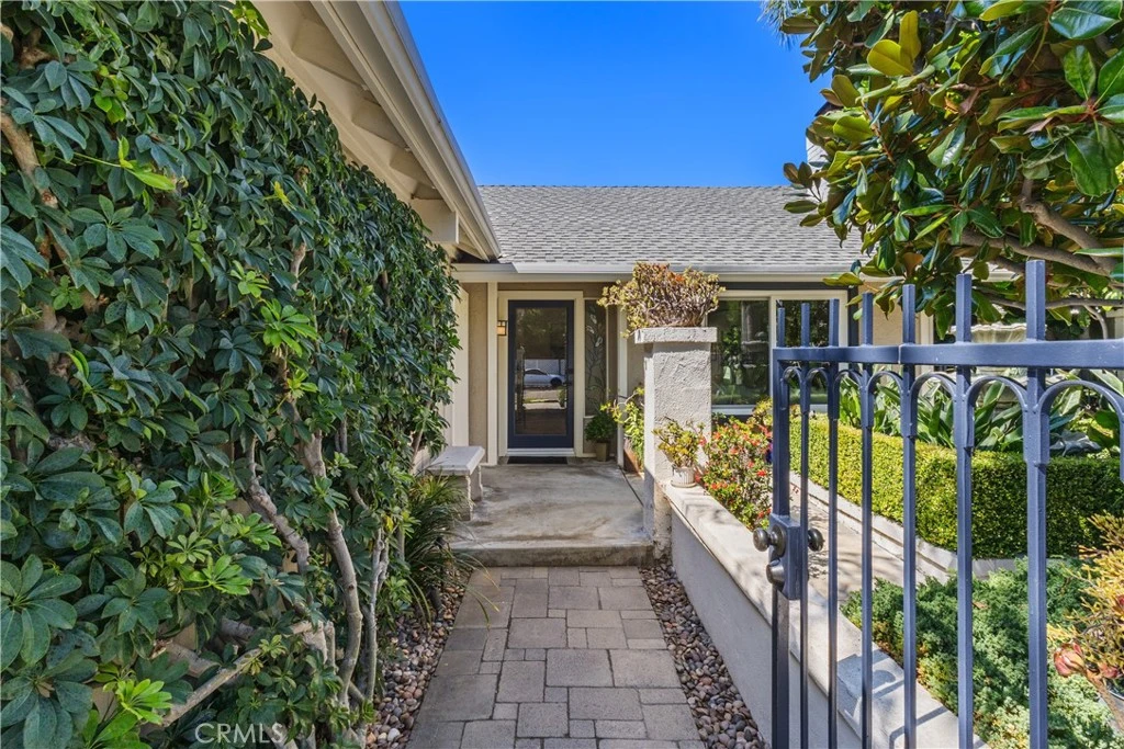 Welcome to your private Laguna Hills oasis—a beautifully maintained, single-level home surrounded by mature tropical landscaping that exudes serenity and privacy. A gated entry leads to a charming courtyard with stone walkways, while custom concrete pavers extend throughout the front and back yards, creating seamless, elegant outdoor spaces. Designed for both relaxation and entertaining, the backyard features a soothing hot tub, a BBQ area, covered dining and sitting spaces, and a fire pit seating area, all set amid lush, tropical greenery. Inside, dual-pane windows and recessed lighting throughout fill the home with light, while a living room fireplace adds warmth and charm. The kitchen boasts a bay window overlooking the backyard, stone countertops, and a built-in wine fridge, blending style and functionality. Freshly painted and professionally cleaned, this home is move-in ready. The 2-car garage provides abundant, easily accessible storage, and the entire property offers unmatched privacy in a peaceful neighborhood. With thoughtful design, luxurious finishes, and an effortless indoor-outdoor lifestyle, this residence is a true sanctuary for comfort, entertaining, and everyday living.