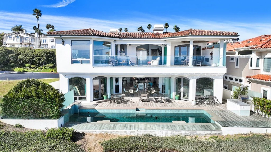 Perched atop prestigious guard-gated Monarch Point, this reimagined coastal estate commands unobstructed panoramic views stretching across the coastline, Dana Point, The Ritz-Carlton, and Monarch Bay. Architecture, scale, and setting converge in a residence designed to celebrate light, volume, and curated artistry. Originally constructed in 1999 and masterfully and totally remodeled throughout in 2023 by renowned architect Karl Francis Dakteris the interior unfolds across two levels with four bedrooms, five full baths, and one half baths on an 11,375 square foot homesite with outdoor spaces that enhance dining, primary retreat, and ocean-view deck, further elevating proportion and presence. Dramatic 20-foot entry crowned by a custom Murano glass chandelier introduces interiors conceived as gallery space. Architectural finishes read as sculptural elements, with dedicated art walls and multiple niches intentionally integrated to showcase collections. Hand-painted ceiling frescoes by mural artist Donovan Fitzgerald add bespoke dimension and refinement throughout. Walls of Sierra Pacific windows and frameless Coverglass folding doors dissolve boundaries between interior and exterior environments, framing whitewater vistas and sunset horizons. Property exudes California lifestyle, as indoor and outdoor living becomes one, creating seamless flow for both everyday living and elevated entertaining. Chef’s kitchen balances precision and beauty with Cantoni cabinetry, Calacatta porcelain surfaces, and professional-grade Thermador and Sub-Zero appliances. Expansive gathering areas anchored by a linear fireplace transition effortlessly to ocean-facing terraces, reinforcing coastal indoor-outdoor living at its finest. Primary suite stretches across the entire ocean-facing elevation, offering sitting lounge with Napoleon fireplace, private kitchen, dual spa-caliber baths with steam showers and Toto Washlets, generous walk-in wardrobes, and expansive deck capturing uninterrupted coastline views. Resort-inspired grounds showcase heated pool and spa, porcelain decking, and fully equipped DCS barbecue island set against panoramic backdrop. Elevator access, 1,200-bottle climate-controlled wine cellar, Control4 automation, Lutron motorized shades, comprehensive security system, and three-car attached garage complete this sophisticated coastal offering. Commanding architectural statement defined by art, craftsmanship, and extraordinary ocean vistas.