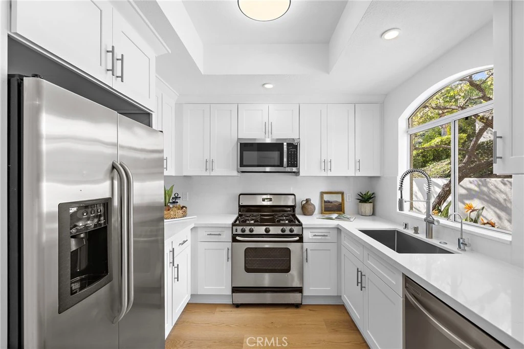 Set within an ideal Laguna Niguel location, this fully remodeled corner residence offers light filled living and effortless access to everything that defines coastal Southern California. Shopping, dining, entertainment, renowned surf breaks, golf courses, and scenic hiking trails are all just minutes away, creating a lifestyle that feels both active and connected. This two bedroom, one bathroom home has been thoughtfully updated with quartz countertops, stainless steel appliances, modern lighting, updated hardware, and a palette of designer neutral paint tones. Laminate flooring flows throughout the space, enhancing the clean and cohesive feel. The living room is bright and welcoming, anchored by a cozy fireplace that adds warmth on cooler coastal evenings. Sliding doors open to a private balcony, extending the living space outdoors. The spacious primary bedroom features both a walk in and reach in closet, while the second bedroom offers flexibility as a guest room, home office, or nursery. Laundry hookups are conveniently located inside the unit, and with no residence below, the home enjoys an added sense of privacy and quiet. A convenient attached single car garage with direct access completes the offering. Community amenities include a pool, spa, and fitness center. Turn key and well positioned, this residence offers a refined coastal lifestyle and is ready for its next chapter in Laguna Niguel.