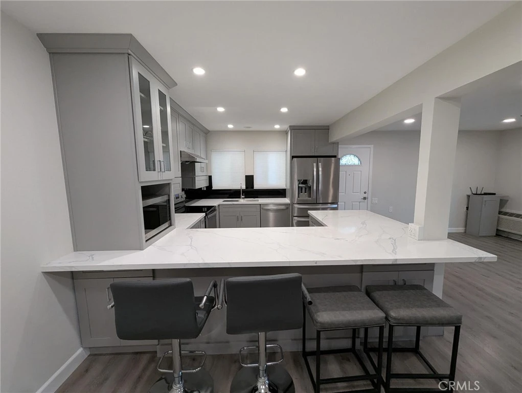 55+ Community! This beautifully updated "CASA CONTENTA" condo offers the perfect blend of comfort, style, and functionality. It is AVAILABLE JUNE 30, 2026. Located steps from the carport, there are NO STAIRS to reach the front door. The spacious living area with recessed lighting and ceiling fan opens to an enclosed patio with functional glass windows is perfect for your home office. The open-concept luxury kitchen include quartz counters that wrap around to include bar seating, stainless steel appliances, and plenty of extra cabinet storage. Other features include newer dual pane windows, smooth ceilings and luxury vinyl flooring throughout. The guest bedroom has a ceiling fan, spacious closet space and access to the patio via sliding door. The Hall bathroom includes a spa quality shower with rain shower head, handheld and bench. The primary suite has recessed lighting, ceiling fan, linen storage, multiple closets, and full size washer/dryer. The ensuite bath includes a jetted soaking tub and bidet style toilet and safety grab bars. Laguna Woods residents enjoy a 27-hole championship golf course, a 9-hole executive par 3 course, pickleball and tennis courts, lawn bowling, gyms, clubhouses, swimming pools, horse stables and over 200+ clubs and organizations.
