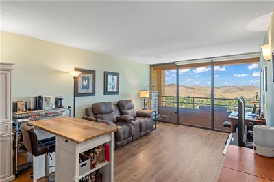 Welcome to Towers #1201 – an upgraded one-bedroom, one-bath “B” floorplan in “The Towers” located in the Laguna Woods senior community. With 625 sq. ft. of living space, this upgraded residence boasts remarkable panoramic North-facing views from both the living room and bedroom of the city lights of Irvine and the hills of Laguna Woods canyon. Far off in the distance but highlighting the view on a clear day the snow-capped peaks of the San Gabriel Mountains and Mount Baldy can be seen. Both the living room and bedroom feature floor to ceiling sliding doors that open to step out balconies. The small kitchenette features an attractive granite countertop and soft-close cabinet drawers. The pantry has convenient pull-out drawers. The updated bathroom has a newer light fixture and a granite countertop. The tub/shower combo has grab bars and a convenient accessory shelf. The unit has been freshly painted in neutral colors. The flooring is wood-like vinyl. The monthly HOA dues include a $500 allowance for meals in the two dining rooms, bi-monthly housekeeping, all utilities (except phone and internet) and 24-hour concierge service plus exclusive Towers on-site activities including live entertainment, movies, exercise classes, etc. In addition, all the regular activities and amenities offered by Laguna Woods Village are included such as tennis, pickle ball, fitness centers, pools, clubhouses, art studio, woodshop and over 200 clubs and organizations.