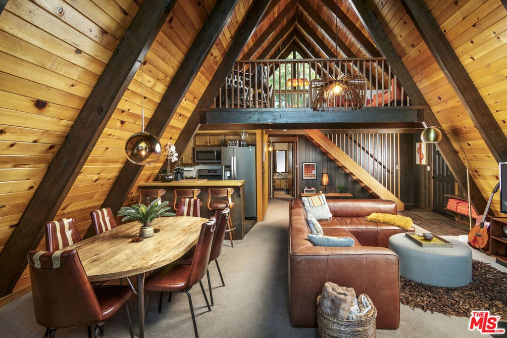 Explore the simplicity and charm of this updated A-Frame with a unique vintage vibe, offered fully furnished for a hassle-free move-in. Its design combines a nostalgic feel with modern comforts, enhanced by an exceptional blend of decor and finishes. This home features two cozy bedrooms, one full bathroom plus a spacious loft. Its open floor plan and soaring ceilings, opening up to the loft above, create a spacious atmosphere. The loft is a true entertainment hub, complete with a game room, stylish bar, and lounge area. The wraparound deck provides stunning views of the Pinnacle Mountains, offering the perfect setting for relaxation or social gatherings. Additionally, the property is equipped with three driveway parking spots, a regulation horseshoe pit, and a fenced dog run, ensuring convenience and safety for pets. Located on a quiet street within the exclusive Arrowhead Woods, this home transcends mere living space. It promises a lifestyle of both relaxation by the fireplace and vibrant gatherings. Make this exceptional home yours today.