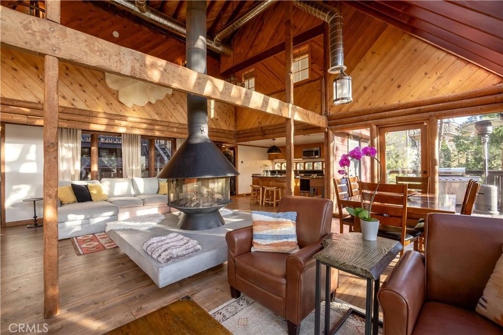 One of a kind mid-century modern residence on the sunny north side of Lake Arrowhead with lake rights. Upon entry is a striking, light-filled great room with floor to ceiling windows transitioning into vaulted skylights, combining sleek interior design with the beauty of nature outdoors. The room provides multiple seating and gathering areas surrounding a unique fireplace and hearth. Open to the living area is a spacious island kitchen with stainless steel appliances and quartz countertops. Doors from both the kitchen and great room lead to a spacious deck with views enhanced by the sounds of a nearby stream The main level is completed with a bedroom with en-suite full bathroom and an additional half-bath off the living area. Upstairs is the primary suite and an additional bedroom with four built in bunks. These rooms are separated by an airy catwalk open to the great room Custom woodwork and numerous windows and modern upgrades are throughout this very special home. The lake trails, UCLA lodge, and tavern bay beach are less than a mile away from the home, while shopping and dining in Lake Arrowhead Village is just minutes away. This retreat is an escape that can entertain and it is no surprise that it has been a highly ranked and reviewed vacation rental. This grants you the option of having your own personal getaway that can successfully generate revenue when not in use.