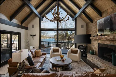 Nestled in prestigious gated Cedar Ridge, this exceptional Mountain Lodge, crafted by the Ron Dolman, exemplifies unparalleled craftsmanship and timeless elegance. Designed to harmonize with its natural surroundings, the residence features a distinctive slate roof, adding to its rustic charm. Upon entering through the custom-built double doors, you're greeted by soaring vaulted ceilings that create an immediate sense of grandeur. The open-concept design seamlessly connects the dining area, a chef-inspired kitchen, and a cozy family room, making it ideal for both intimate gatherings and large entertaining. A rare find, the main-level master suite offers privacy and convenience. French doors open to expansive decks providing a tranquil retreat. Through the trees, a filtered lake view adds to the room's serene ambiance. Ascending the sweeping solid oak staircase leads to four generously sized bedrooms, each accompanied by its own private en-suite bathroom. This thoughtful design ensures comfort and privacy for all. The lower level is designed for leisure and entertainment, featuring a spacious game room complete with a wet bar. A full bathroom and a substantial storage room add to the functionality of this space. Catering to outdoor enthusiasts, the property includes an RV/boat garage equipped with a workbench. Additional parking accommodates at least seven vehicles, including boats and RVs, ensuring ample space for all your recreational needs. A spacious office located below the RV garage, accessible via dual entries, offers a quiet workspace, ideal for remote work or study. Surrounded by majestic cedar trees and the tranquility of nature, the home emphasizes indoor-outdoor living. Multiple decks invite relaxation and provide the perfect setting for enjoying the serene environment. Offered fully furnished, the property includes all fine furniture and decor, allowing for a seamless transition into this mountain sanctuary. This residence is a rare gem, combining luxurious amenities with the natural beauty of Cedar Ridge, offering an unparalleled mountain living experience.