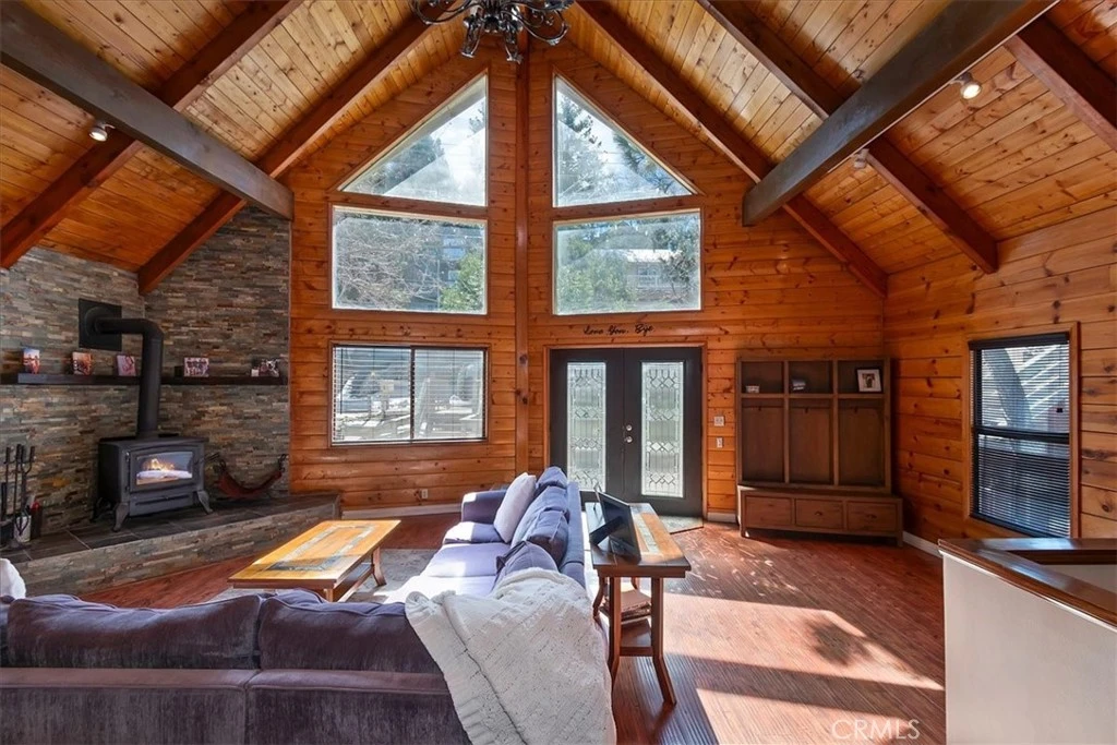 Unique mountain retreat featuring a rare in-ground pool and spa located in Lake Arrowheads charming Deer Lodge Park community. Situated on a spacious corner lot, this property offers a detached garage with ample storage below and a newly redone parking deck. Two separate yard areas provide space for the pool, entertaining, pets, or potential tenants. Just a few steps lead to the front door where you enter the open-concept main living area featuring vaulted, beamed T&G ceilings and a dramatic wall of windows that fills the space with natural light. The living room includes a newer wood-burning stove for cozy winter evenings and a newer A/C split unit for comfortable summers. The kitchen features a large island with a gas cooktop and breakfast bar seating, granite countertops, and double ovens. The dining area overlooks the beautiful pool and spa, creating a perfect setting for entertaining. The main floor offers two bedrooms and a bathroom. Upstairs, you’ll find a spacious primary suite with a loft office area, two separate vanity's; one with dual sinks and other for getting ready, walk in closet, and a private balcony. The lower level includes a separate apartment ideal for rental income or guest accommodations, with the potential to convert it back into part of the main residence. It offers one large bedroom with ample storage, bathroom, kitchen, pantry, and sunroom feel dining room, with fenced side yard. Large laundry room/mudroom. Enjoy outdoor living in the charming poolside gazebo, perfect for relaxing or entertaining. If you love nature and hiking there are trails and the popular Pinnacles to explore nearby. Whether you’re looking for a full-time residence that feels like a private staycation or a mountain vacation retreat, this property is truly one of a kind!