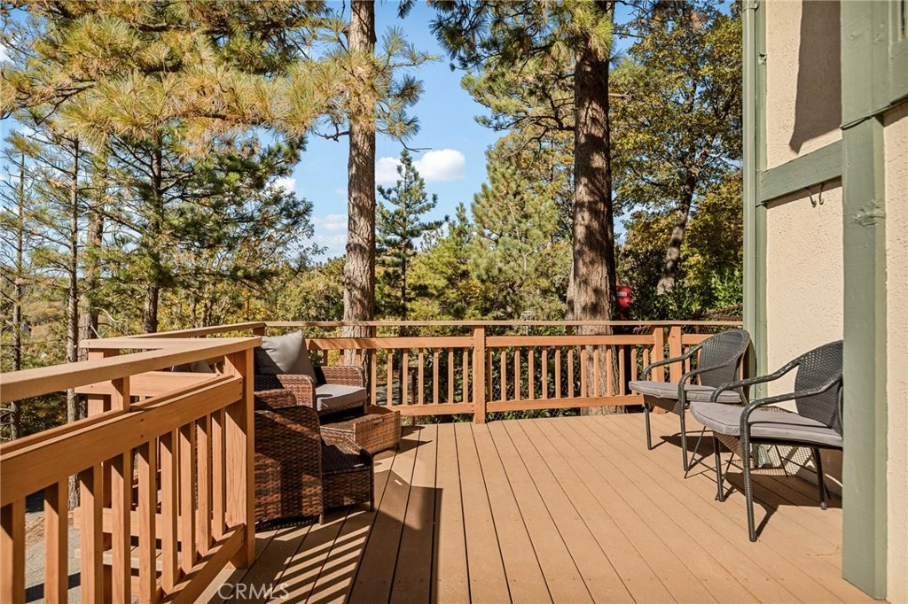 Remodeled Lake Arrowhead home with lake rights and a two-car garage. Lake and mountain views appear from multiple rooms, and the usable backyard extends the living space outdoors. Inside, the main level brings everyone together: an updated, open kitchen with solid-surface counters, refreshed lighting, and generous cabinetry flows to the dining area, where sliders open to a covered patio for year-round use. The living room centers on a classic brick fireplace, complemented by a bay-window bench that frames the view. The versatile layout offers four bedrooms plus a loft and an adjoining bonus room currently used as a fifth bedroom. The primary suite stands out with vaulted ceilings, a floor-to-ceiling stone fireplace, a spacious walk-in closet, and lake views. On the lower level, a large recreation room features wood-beamed ceilings, space for a pool table, a wet bar, and another fireplace—well-suited for gatherings or game nights. Outdoors, a terraced, low-maintenance yard pairs with a covered patio for easy indoor-outdoor flow. Located in Arrowhead Woods with lake rights, the property sits near trails, the Village, and marina amenities. Move-in ready and thoughtfully updated, it blends mountain character with modern conveniences.