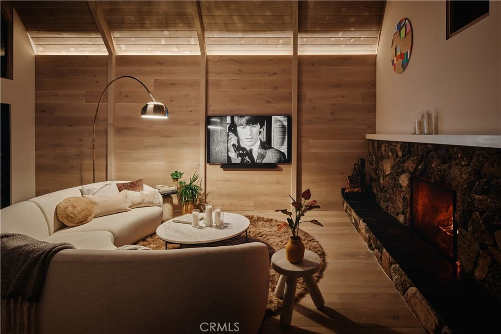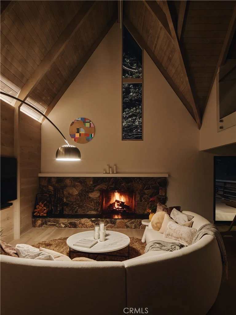 Perched in the pines of Lake Arrowhead, this striking architectural retreat reimagines a classic 1960s cabin into a sophisticated, modern mountain escape. Designed by Dan Brunn Architecture, a renowned firm known for thoughtful residential work, the home is defined by its rare double A-frame form, blending iconic character with a refined, minimalist palette inspired by Scandinavian and Japanese influences. Original wood elements were preserved and revived through walnut blasting, bringing warmth and authenticity to the contemporary upgrades throughout. Spanning three levels, the layout offers restful privacy on the lower floor with the primary suite, vibrant gathering spaces and a guest suite on the main level, and a dramatic loft retreat above. The central living room is anchored by a tumbled-boulder fireplace and framed by tall glass that captures sweeping forest views. A custom terrazzo countertop, navy Fenix cabinetry, and curated lighting elevate the kitchen and dining space into a true showpiece, while mid-century influences and soft textures add depth and comfort. Outdoor living takes full advantage of the setting, relax on the deck overlooking the trees or soak in the jacuzzi and breathe in the crisp mountain air. Just beyond the backyard, a forest trail leads directly to the UCLA Conference Center and Tavern Bay Beach Club, only a short walk or easy golf-cart ride away, placing you in one of Lake Arrowhead’s most desirable locations. Sustainability guided the transformation, preserving the original structure while enhancing comfort and style. Perfect as a high-end investment or true mountain vacation home, Arrowhead Double A-Frame is a rare opportunity where architecture and nature meet in perfect harmony, just moments from the lake.