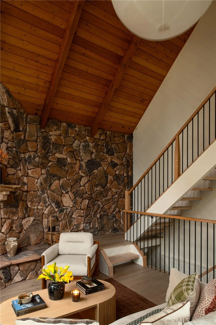A Japandi-inspired mid-century retreat tucked on a peaceful cul-de-sac in Lake Arrowhead and surrounded by tall pine trees. This thoughtfully renovated cabin blends warm natural textures with clean lines, wood details give the home a calm feel throughout; just minutes from hiking trails, local shops, and mountain restaurants. Inside, the main level opens to a bright, airy living room with floor-to-ceiling windows and stunning forest views. The post-and-beam vaulted ceiling paired with the original stone fireplace brings timeless mid-century character. The newly upgraded deck extends the living area outdoors—perfect for morning coffee or relaxing in the fresh mountain air. The custom kitchen is thoughtfully designed with rift-sawn white oak cabinetry, Calacatta Oro marble countertops and backsplash, open shelving, and Italian appliances. The layout creates a warm, functional space ideal for cooking and hosting. A bedroom sits near the kitchen, along with a beautifully finished bathroom featuring a Calacatta Arabescato marble-wrapped bathtub, handmade Moroccan tile, and a custom oak vanity with a fully integrated marble sink. A handcrafted oak staircase, built by an experienced carpenter leads to the upper level, where the primary suite offers treetop views and peaceful privacy. The spacious room fits a king bed with extra space for a twin, making it ideal for families. The ensuite bathroom includes marble flooring, plaster-finished walls, and a custom oak vanity. The property is surrounded by nature, multiple outdoor seating areas, and wall of glass that invite the lighting into living space. It’s perfect for family gatherings during the holidays, weekend getaways, or even full-time living. The property sits on a wide lot. Additional parking spaces are a possibility. Schedule a showing today, this home feels even better in person.