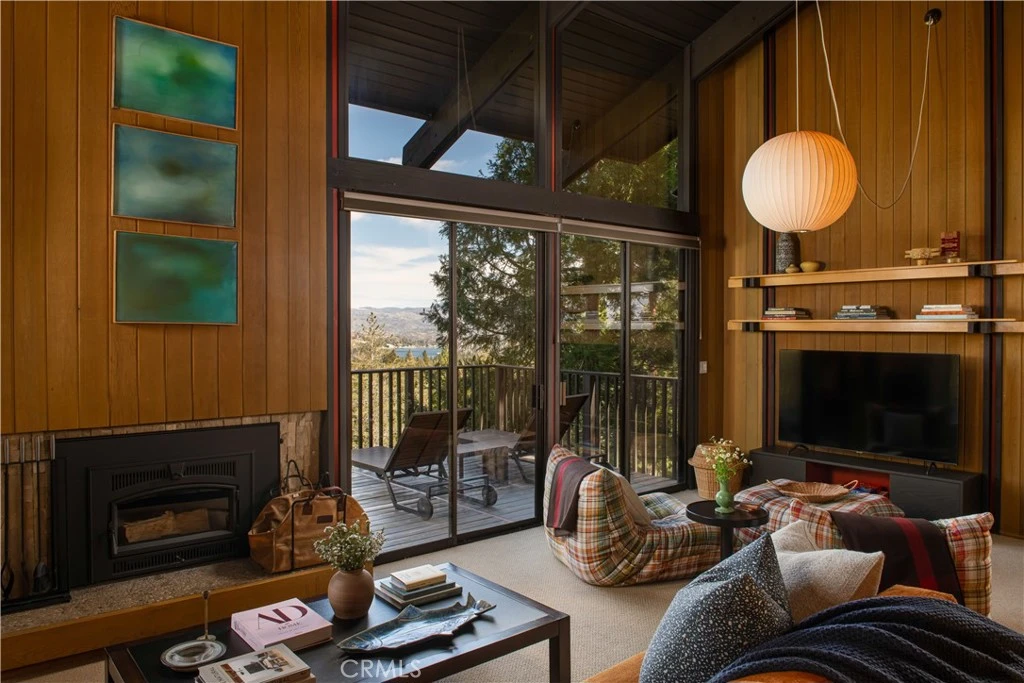Step back in time at 287 Grizzly Road, a 1967 mid-century modern residence—originally designed by AIA architect R. Neil Manos and known as the “Mountain Cabin”—with lake views and a wealth of original features. Vertical cedar siding anchors the captivating exterior of the home amid towering pines. Inside, the main floor boasts vaulted ceilings with exposed beams and eye-catching, unique architectural elements, floor-to-ceiling windows, and sweeping lake and mountain views. A wood-paneled living area with a wood-burning fireplace opens to a formal dining space adorned by two notable Herman Miller Nelson pendant lights, original built-in shelving reflecting the home’s signature red stripe—carried from the front of the house throughout the interior and out onto the decks—and a lake view, adjacent to an updated galley kitchen. Expect authentic mid-century details, including the three original Herman Miller light fixtures, an open-back built-in, and a sunken wet bar, an unexpected detail for added entertainment. Sliding doors flank the fireplace, opening to a spacious deck for lounging, dining, and embracing the unparalleled lake and mountain views. The main floor is complete with a powder room adorned with original mid-century modern sconces. Down the original pebble-stone and concrete stairs are two full baths and three ample-sized bedrooms, one serving as a recreation and bunk room. Each bedroom offers tree views and exposed wood beams. One bath remains a 1960s time capsule with original tile and wood paneling. This home is a true collectors piece. Other amenities include a two-car garage and an oversized parcel with outdoor living potential. Ideally located with close proximity to North Bay, Blue Jay, the Lake Arrowhead Country Club, and nearby hiking trails. Lake Rights are included with the purchase of this home. Prime North Bay dock available for additional price.