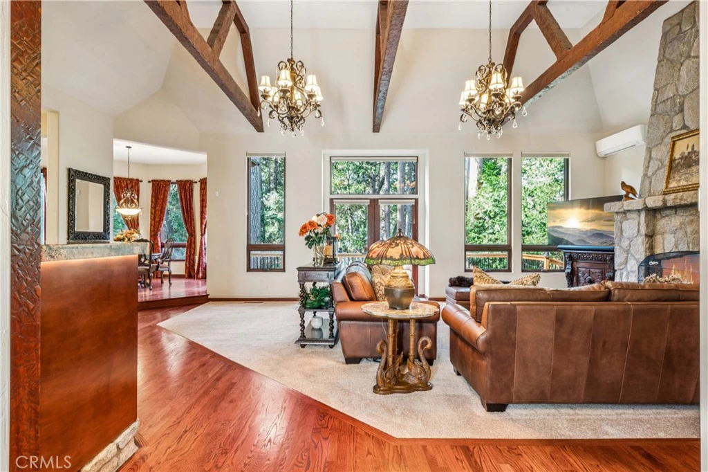 Experience timeless elegance in this one-of-a-kind French Château–inspired located in the prestigious gated community of Cedar Ridge Estates. Set on over one acre on a private corner lot, this custom single-level home is surrounded by towering cedar and pine trees, offering exceptional privacy, tranquility, and mountain beauty. Thoughtfully designed with Old World charm and craftsmanship throughout, the home features a spacious open great room highlighted by a massive granite fireplace and hand-hewn beam work, creating a warm and dramatic gathering space. The luxurious main-level primary suite includes its own granite fireplace, providing a peaceful retreat with classic European character. The gourmet kitchen is equally impressive with an additional granite fireplace, custom cabinetry, and quality finishes, blending rustic mountain elegance with functional design. 3 bedrooms 2.5 bathrooms, bonus room, A/C, whole-house generator and 3 car garage. Boat dock available.